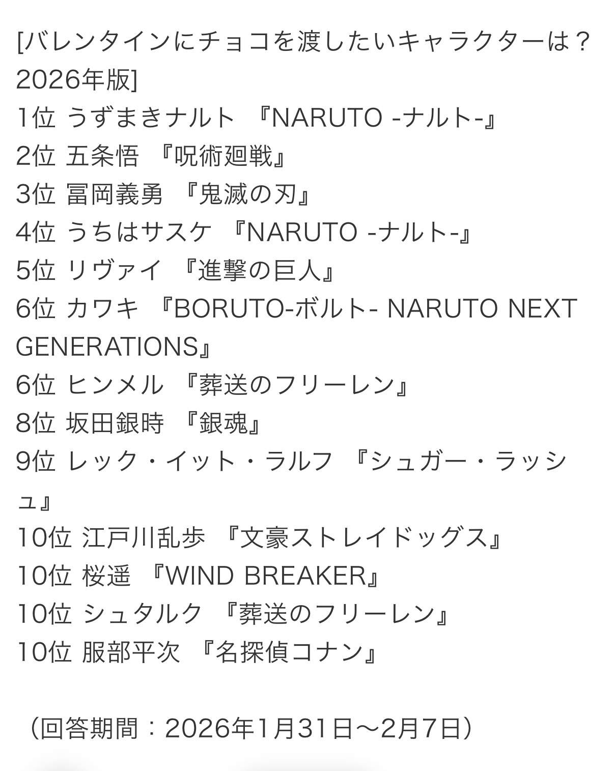 票选【你想把巧克力送给哪个角色】🍫🎁💘2026年版鸣人连续两年都排在第一位