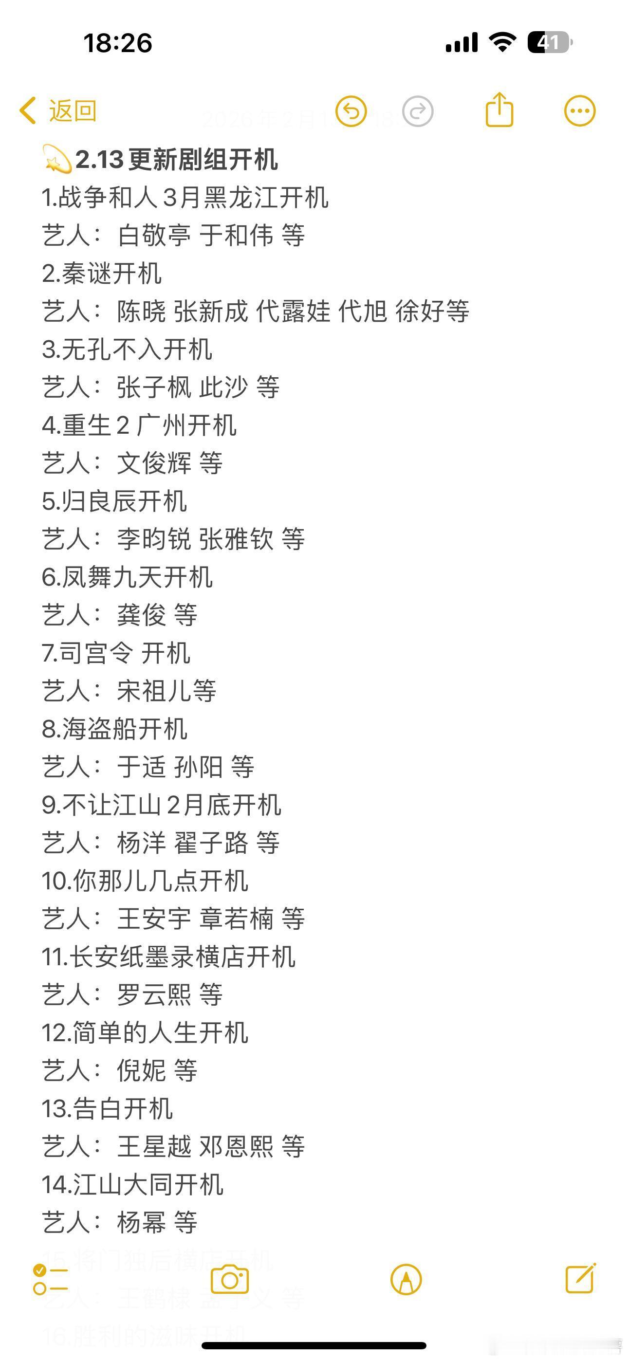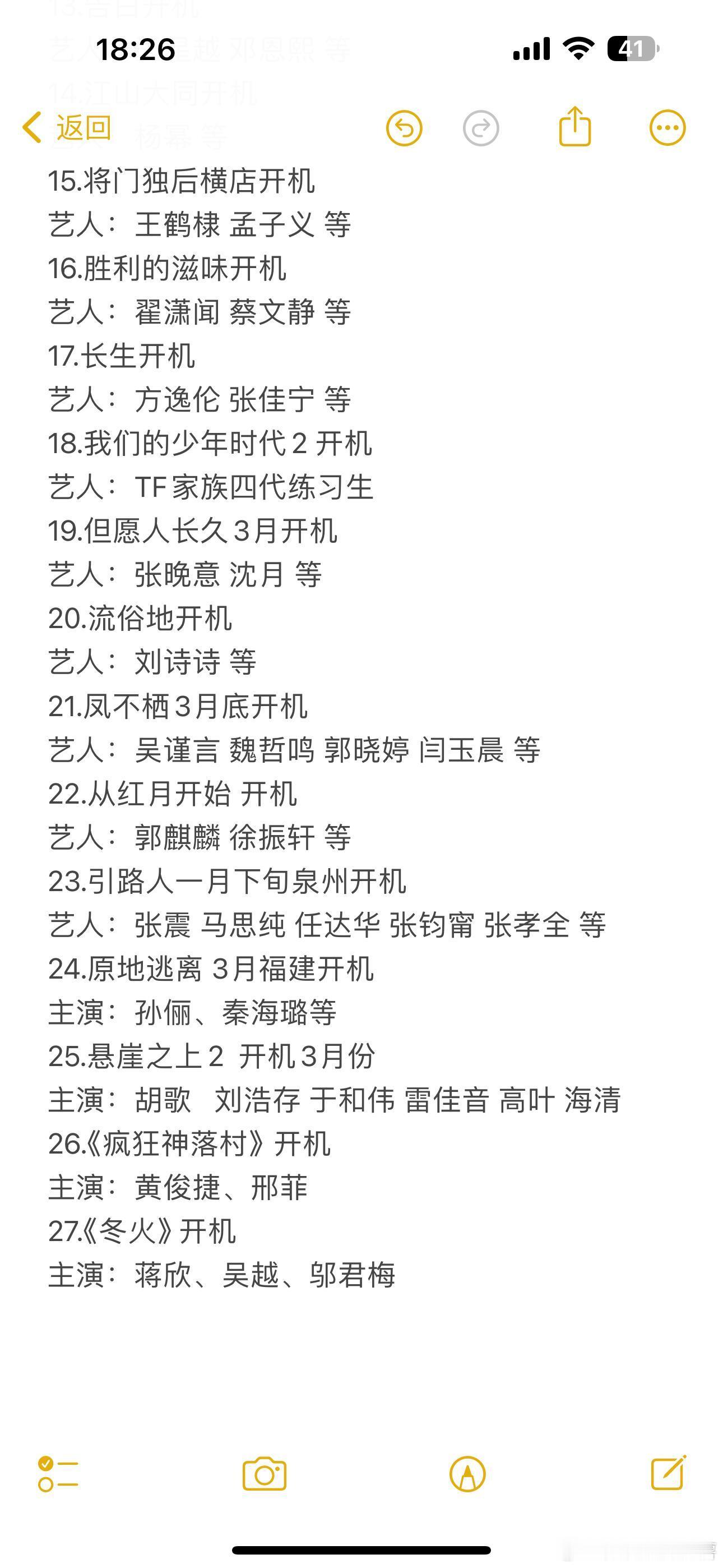 💫更新剧组开机1.战争和人3月黑龙江开机艺人:白敬亭 于和伟 等2.秦谜开机艺人:陈晓 张新成 代露娃 代旭 徐好等3.无孔不入开机艺人:张子枫 此沙 等4.重生2 广州开机艺人:文俊辉 等5.归良辰开机艺人:李昀锐 张雅钦 等6.凤舞九天开机艺人:龚俊 等7.司宫令 开机艺人:宋祖儿等8.海盗船开机艺人:于适 孙阳 等9.不让江山2月底开机艺人:杨洋 翟子路 等10.你那儿几点开机艺人:王安宇 章若楠 等11.长安纸墨录横店开机艺人:罗云熙 等12.简单的人生开机艺人:倪妮 等13.告白开机艺人:王星越 邓恩熙 等14.江山大同开机艺人:杨幂 等15.将门独后横店开机艺人:王鹤棣 孟子义 等16.胜利的滋味开机艺人:翟潇闻 蔡文静 等17.长生开机艺人:方逸伦 张佳宁 等18.我们的少年时代2 开机艺人:TF家族四代练习生19.但愿人长久3月开机艺人:张晚意 沈月 等20.流俗地开机艺人:刘诗诗 等21.凤不栖3月底开机艺人:吴谨言 魏哲鸣 郭晓婷 闫玉晨 等22.从红月开始 开机艺人:郭麒麟 徐振轩 等23.引路人一月下旬泉州开机艺人:张震 马思纯 任达华 张钧甯 张孝全 等24.原地逃离 3月福建开机主演:孙俪、秦海璐等25.悬崖之上2 开机3月份主演:胡歌 刘浩存 于和伟 雷佳音 高叶 海清26.《疯狂神落村》开机主演:黄俊捷、邢菲27.《冬火》 开机主演:蒋欣、吴越、邬君梅