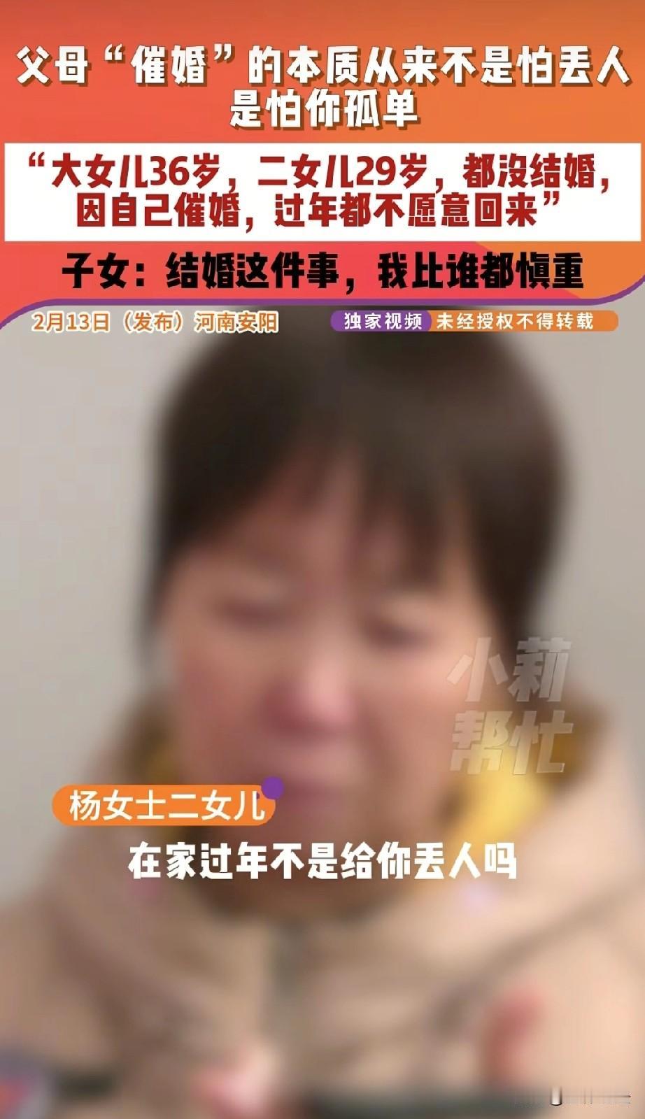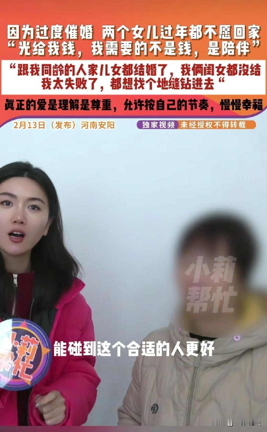 河南安阳,大妈的两个女儿,一个36岁,一个29岁,年龄都不小了,但一直不结婚。看着同龄孩子结婚生子,大妈心急如焚,不停催女儿,还说女儿不结婚把她的脸都丢尽了,她恨不得找个地缝钻进去。这话让女儿们心寒,连续几年都不回家过年,倍感孤独的大妈泪流满面,表示那都是自己一时着急说的气话,催婚不是怕丢人,是怕女儿们以后孤单。 杨大妈有两个女儿,大女儿36岁,二女儿29岁,都还没结婚。 杨大妈心里十分着急,传统观念作祟,她觉得女儿到了一定年纪就该结婚生子,不然就会被人指指点点,让自己脸上无光。 所以,她时不时就在两个女儿耳边念叨催婚的事儿,还直言女儿不结婚是给她丢脸。 大女儿和二女儿其实心里都有自己的盘算。在她们看来,当下最重要的是把工作做好,在社会上站稳脚跟。 爱情和家庭若能遇到合适的人,自然是锦上添花;若遇不到,自己也不愿将就。 每次听到母亲催婚,她们都觉得母亲根本不理解自己,心里烦躁不已。 这两年,因为催婚的事儿,母女之间的矛盾愈发尖锐。 每到过年,本是一家人团团圆圆、热热闹闹的时刻,可两个女儿一想到回家就要面对母亲没完没了的催婚,心里就直犯怵。 为了避免和母亲发生冲突,她们干脆选择不回家过年。 过年时,杨大妈看着别人家放炮、走亲访友,一片热闹景象,自己家里却冷冷清清,两个女儿都不回来瞧她,心里委屈极了,也倍感孤单。 她忍不住泪流满面,一瞧见别人家同龄孩子的儿女都家庭幸福圆满,而自己的两个女儿还孤身一人,怎么说都不听,不知道自己犯了什么错。 过年连放炮的人都没有,她觉得自己是个失败的母亲,连一个孩子的任务都没完成,恨不得找个地缝钻进去。 杨大妈越想越伤心,她觉得自己催婚并非是因为怕丢人,而是自己从事护理行业,曾伺候过大龄未婚的女性,深知她们无助,没人关心看望。 她切身体会到那种凄凉,所以心疼自己的女儿,害怕女儿等不到结婚就变老,成了没人管的老姑娘。 况且,两个女儿现在都不回家看她,也不主动联系她,只给她钱,可她需要的不是钱,而是陪伴。 面对母亲的这般状态,杨大妈的二女儿心里也有所触动,她明白母亲是爱自己的,只是方式欠妥。 她思索后决定,今年过年准备回家,和母亲好好沟通一番。 其实,父母都希望孩子能在合适的年纪结婚生子、成家立业,这是他们的一片苦心。 可年轻人有自己的想法和生活节奏,他们希望先实现自我价值,再考虑爱情和家庭。 这场催婚风波里,母女都有自己的委屈和无奈。真正的爱,应该是尊重和理解,允许孩子们按自己的节奏慢慢收获幸福。 《民法典》第1042条规定:禁止包办、买卖婚姻和其他干涉婚姻自由的行为。 本案中,杨大妈的两个女儿均为成年女性,依法享有完整的婚姻自主权,是否结婚、何时结婚、与谁结婚,均由其自主决定,不受他人强制。 杨大妈出于传统观念与关爱,长期念叨、指责女儿“不结婚丢脸”,以“被人指指点点、脸上无光”施加精神压力,虽未使用暴力、拘禁等极端手段,但已超出合理关心范畴。 此类行为违背了婚姻自由基本原则,成年子女有权拒绝,并可通过沟通、调解要求父母停止不当干预。 但是,两个女儿因为母亲催婚,仅以给付金钱的方式履行经济赡养义务,长期不回家过年、不主动联系、拒绝陪伴,忽视母亲的精神慰藉需求,已构成赡养义务履行不完整。 子女不得以“母亲催婚不当”为由免除法定赡养责任,更不能以疏离亲情的方式对抗家庭矛盾。 女儿在坚守婚姻自主的同时,通过常态化沟通、定期探望履行精神赡养义务,化解母女矛盾。 希望杨大妈和她的两个女儿能通过沟通,尽快解开彼此的心结。