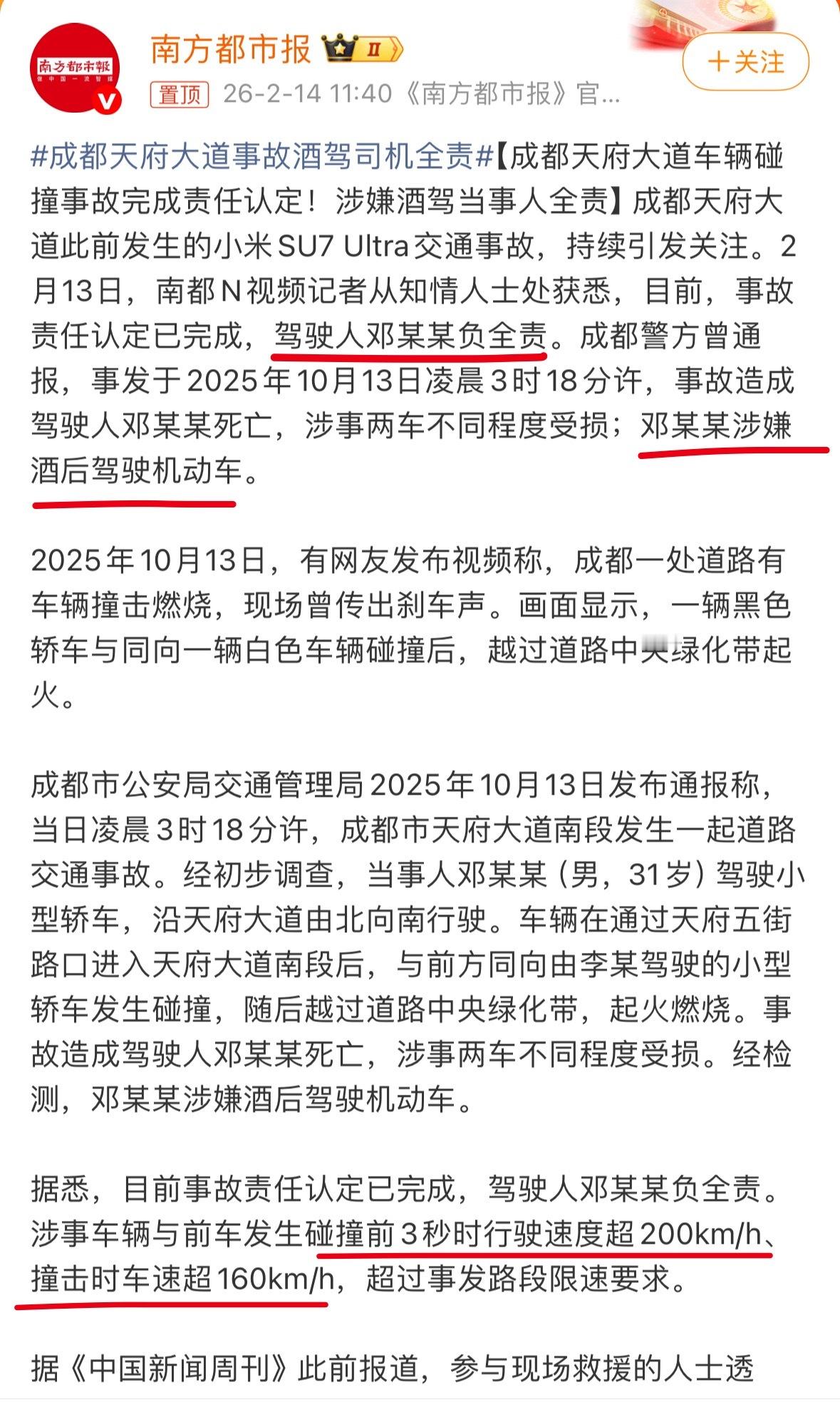 碰撞前3秒车速超过200km/h,撞车时车速超160km/h,酒驾+超速,全责没跑了。