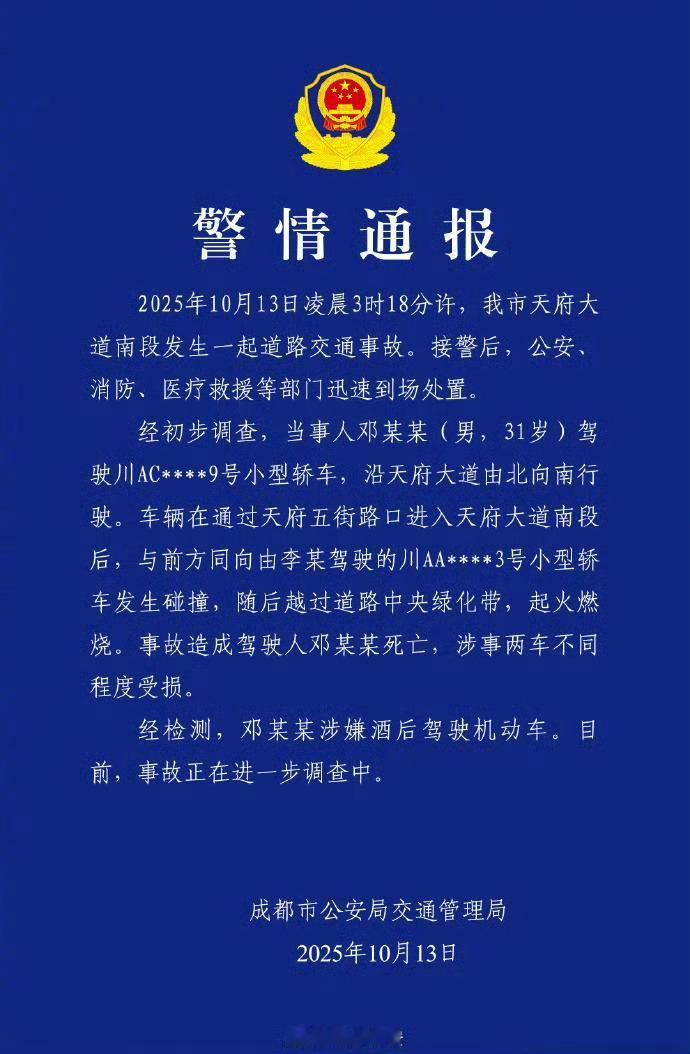 成都天府大道事故酒驾司机全责这个事故原因去年就通报了,系司机酒驾撞车,越过中央绿化带,起火燃烧。