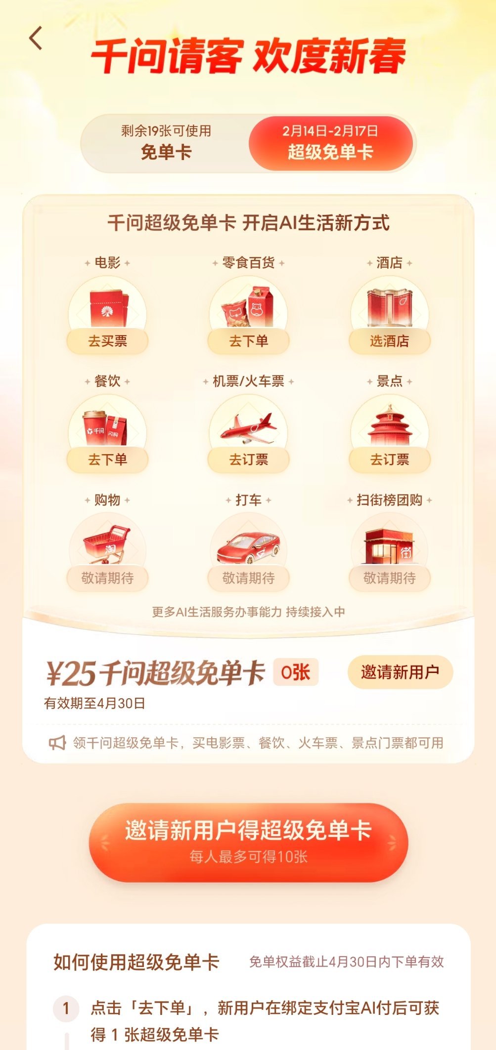 千问春节超级免单卡派送中 千问第二轮开始,不止点外卖还能买电影票订酒店定火车票机票打车,没下的可以存着用 网页链接