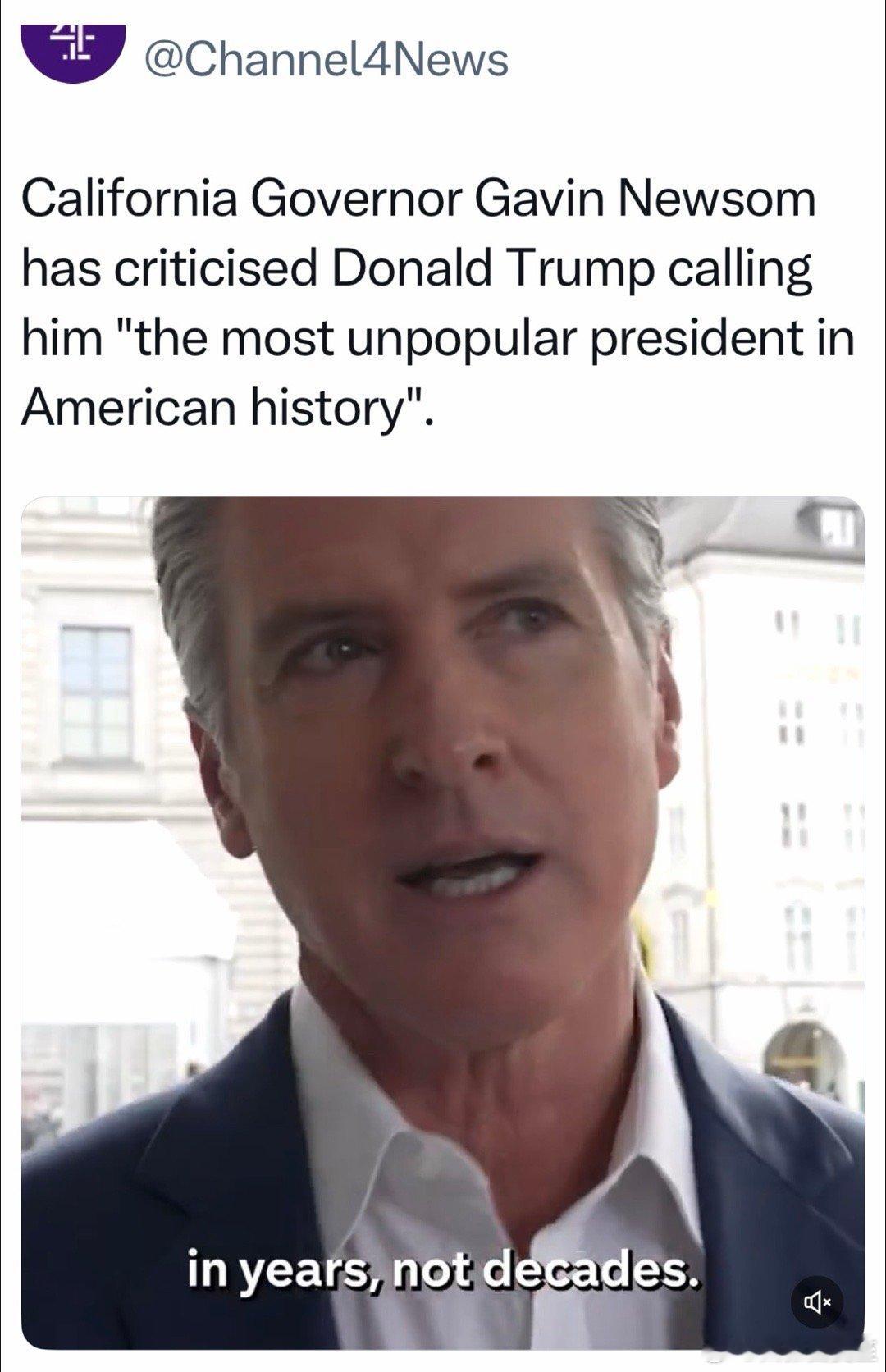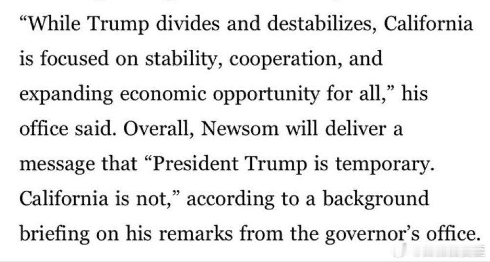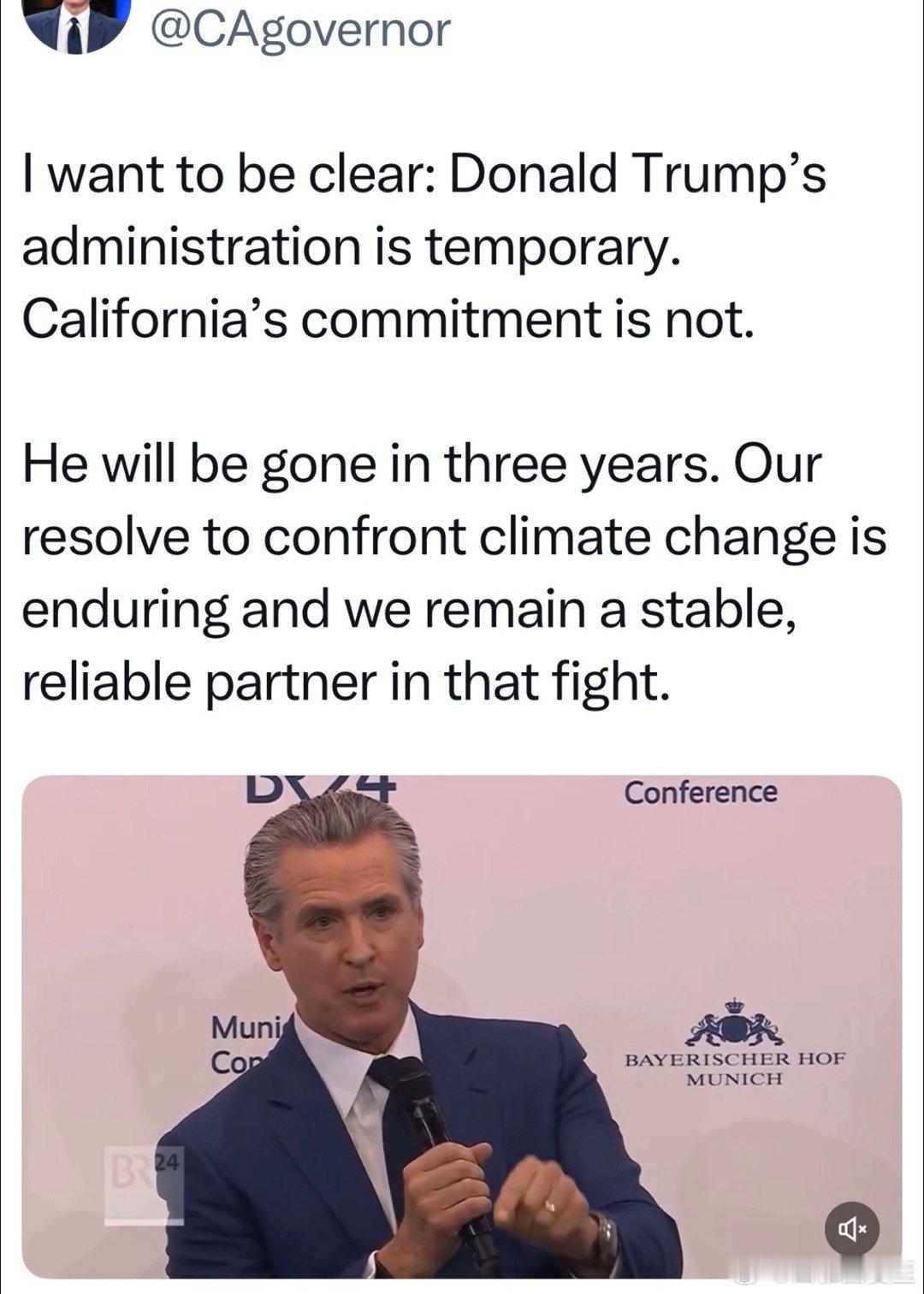 加州州长Newsom在慕尼黑安全会议期间发言的主旨:Trump的地位是暂时的,以年计…他在美国并不受欢迎…中期选举后,他的影响力会被削弱…加州的地位是长久的,加州会致力于稳定、合作、共同繁荣