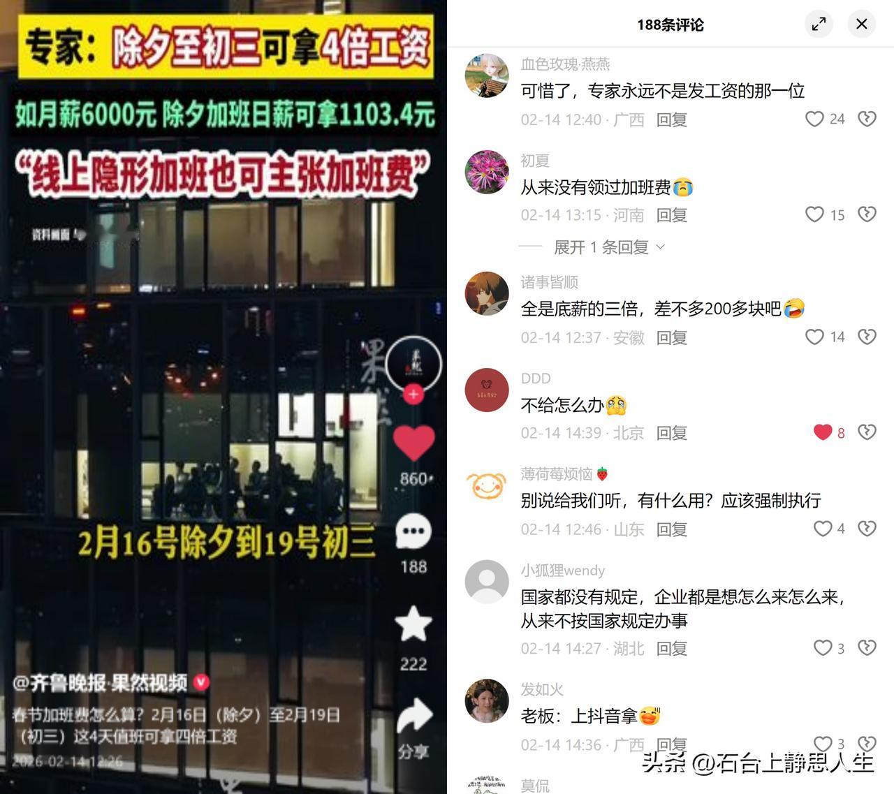 春节加班4倍工资?小心被套路! 今年春节9天假,其中除夕到初三4天是法定节假日,按规矩本该拿4倍日工资,剩下5天是调休,能补休就补休,补不了得给2倍加班费。 但现实中,好多企业早就玩起薪资拆分的鬼把戏, 比如你实际月入8000,劳动合同偏写基本工资3000,剩下的全算绩效、津贴,算加班费时只按3000的基数算3倍,直接把你该得的钱砍没一大半! 别被老板蒙了!法律早定死了: 要是合同里的基本工资远低于实际工资(比如低于实际的70%),或者实际发的工资里有固定绩效、岗位津贴,那这个只按基本工资算的约定就是无效的!这些固定收入本来就该算进加班费基数,老板的文字游戏,就是明着薅打工人的羊毛! 看看大家说的全是心酸:有人从来没拿过加班费,有人只拿到底薪的3倍,才200多块。凭啥我们放弃假期卖命,老板就敢明目张胆违反规定? 真遇到这种情况别认栽!留好工资条、考勤记录、微信加班消息截图,这些都是维权硬证据,直接找有关部门一告一个准! 你们春节加班被坑过吗?一起来聊聊!