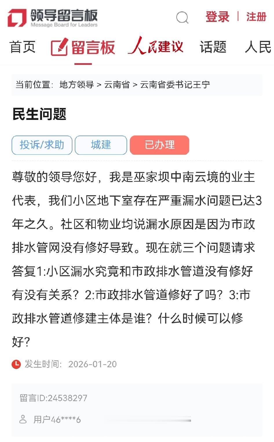 【昆明网民投诉小区地下室漏水严重及雨污水规划】 昆明网民通过领导留言板给云南省委书记留言反映 ✍📩民生问题 尊敬的领导您好,我是巫家坝中*X境的业主代表,我们小区地下室存在严重漏水问题已达3年之久。社区和物业均说漏水原因是因为市政排水管网没有修好导致。 现在就三个问题请求答复1:小区漏水究竟和市政排水管道没有修好有没有关系?2:市政排水管道修好了吗?3:市政排水管道修建主体是谁?什么时候可以修好? 发生时间: 2026-01-20 2026-02-09 19:00 📩✍昆明中央商务区管理委员会官方回复 网民同志:您好! 您通过人民网领导留言板的留言已收悉,经昆明中央商务区管理委员会认真调查处理,现将有关情况回复如下: 您所反映的中XX境小区位于春城路以北,巫家坝路东侧,由云南X房地产开发有限公司开发建设,施工单位为江苏Xx建筑产业集团有限公司,监理单位为昆明XX咨询管理有限公司。 一是小区地下室漏水的原因为外部市政管网尚未建设完成和小区内部地下室建设存在质量问题,自交房以来,小区地下室已多次出现墙体开裂、渗水等质量问题。经昆明市质量监督管理部门多次核查,已多次约谈该小区建设单位江苏XX建筑产业集团有限公司并下发工程质量安全整改通知书。 二是按照片区市政雨水管专项规划,该小区排水路径为:小区-巫家坝路-宏图路(397路)-雨水泵站-春城路压力管-枧槽河。春城路由市级部门负责修建,已于2025年12月30日开放宝海路至巫家坝路段,现正继续加快建设。 雨污水管由市、区两级统筹建设,现目前由*X发公司具体实施,雨水泵站由昆明*X公司负责建设,现主体工程已完工,待外部供电接入和春城路排水压力管道建设完成后,即可投入运行。 感谢您的理解与支持,顺祝身体健康、生活愉快! 漏水 小区
