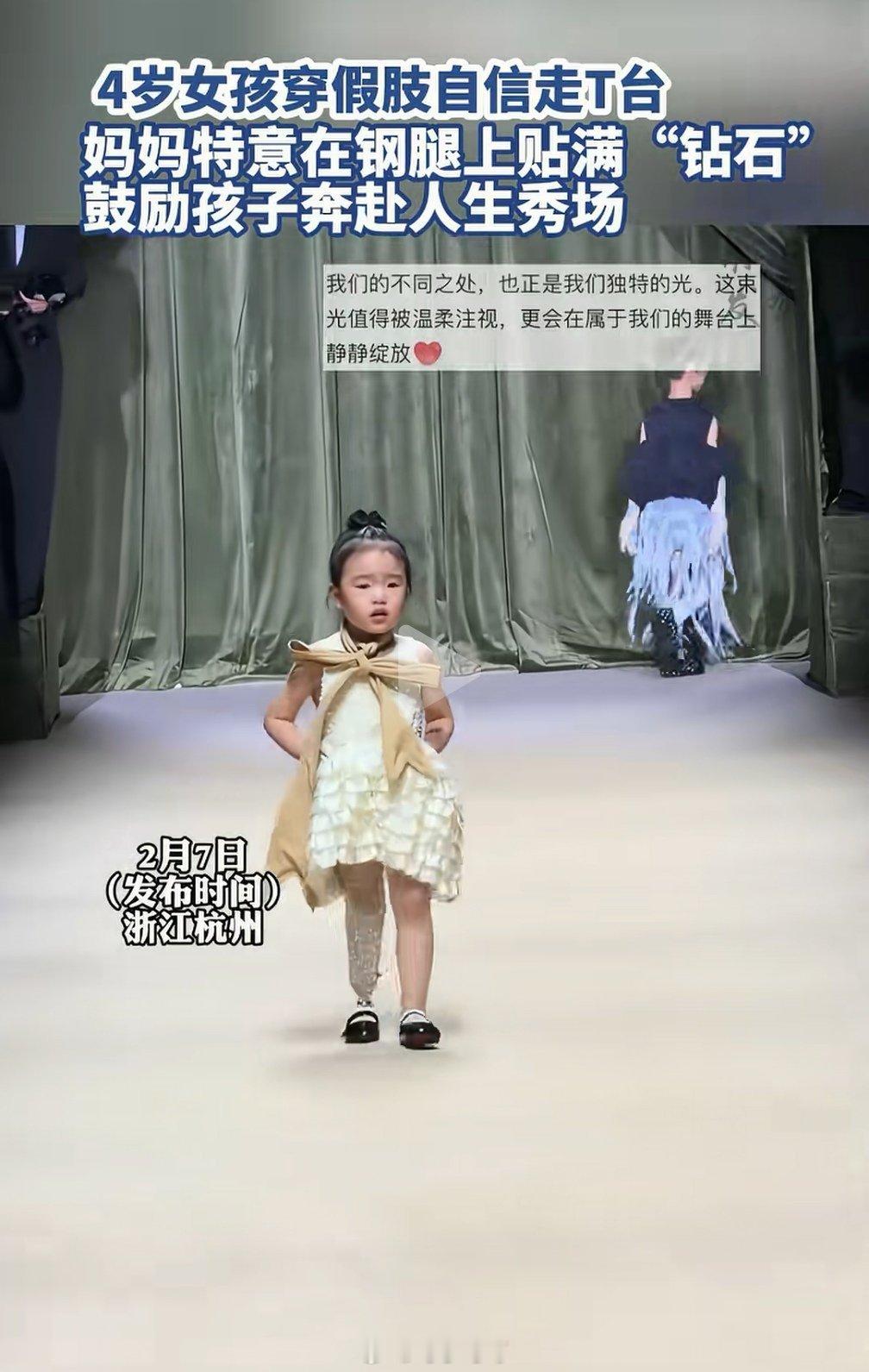 假肢女孩出生时因疾病失去一条小腿,她的麻麻给她最大的托举和终身的财富,就是让她“不惧怕他人的目光”。麻麻真的很优秀。孩子现在还小,很多事都不懂,一生的路很长,还要面临很多的挑战。但我相信这个家庭的底色,是有智慧有力量有能力的,孩子会顺利过关。上天夺去了她的一条腿,却给了她一个勇敢和会思考的麻麻,希望她今后不再有磨难,一直做那个自信的、闪闪发光的人。