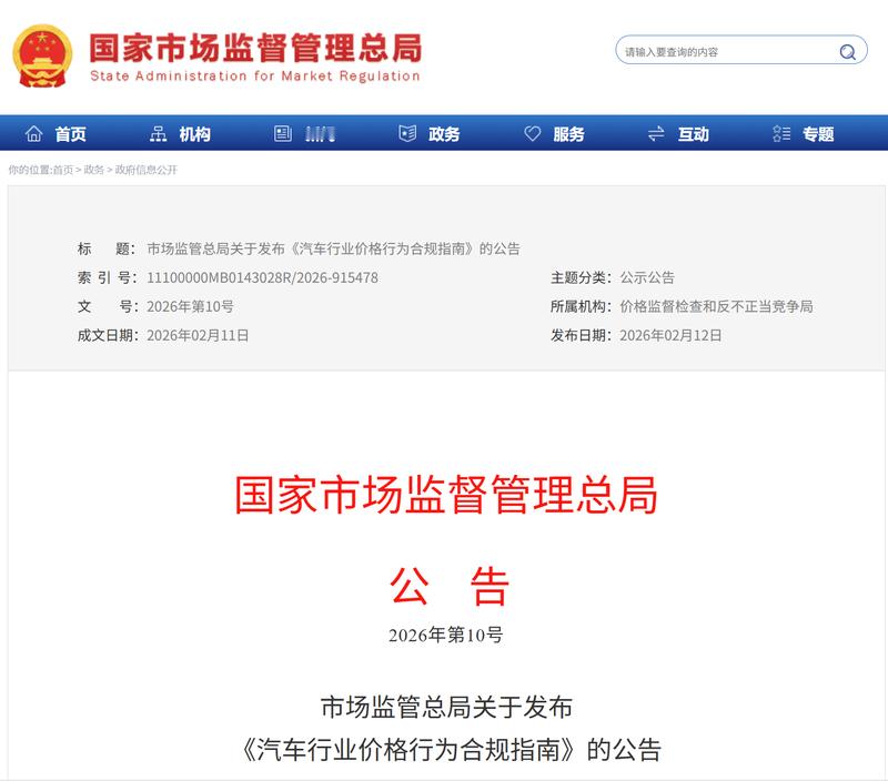 2月12日,国家市场监督管理总局正式发布《汽车行业价格行为合规指南》,核心目的是整治汽车行业“内卷式”竞争,规范汽车市场各类价格行为,维护市场公平竞争秩序,保障消费者与经营者的合法权益,推动汽车行业高质量发展。《指南》重点明确了对各类价格违法行为的整治方向,包括不按规定明码标价、价格欺诈、虚假促销等,明确提示相关行为存在重大法律风险,为监管工作提供了清晰依据。