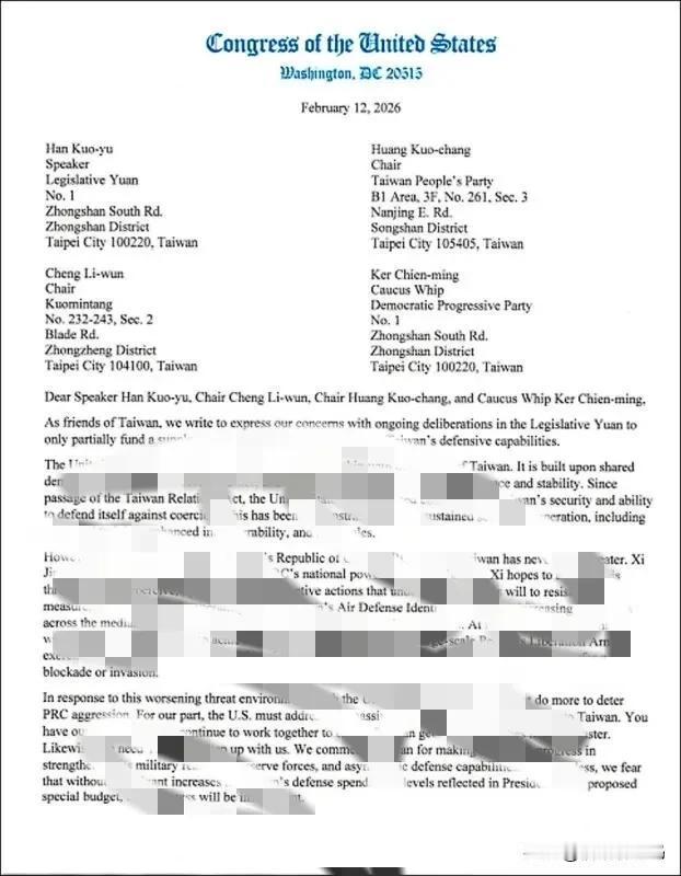 美37名跨党派议员联名施压 要求台立院通过巨额特别预算 2026年2月14日,综合媒体报道,美国国会跨党派议员再度介入台湾内部事务。据悉,包括参众两院在内的37名跨党派议员于2月12日联名致函台湾“立院”,就总额高达1.25兆元(新台币,下同)的“防务”采购特别预算案审议受阻一事表达“严重关切”,并强烈呼吁台湾朝野各方尽速通过该预算案。 此次联名信由联邦参议员里基茨(Republican)、昆斯(Democratic)、众议员金映玉(Republican)及贝拉(Democratic)共同领衔发起,收件对象涵盖台湾“立院院长”韩国瑜、国民党主席郑丽文、民众党主席黄国昌以及民进党团总召柯建铭。值得注意的是,信函副本亦明确寄送给国民党团总召傅崐萁与民众党团总召陈清龙。 目前,这笔为期八年的1.25兆元特别预算案在台湾“立院”程序委员会已遭在野党联手多次封杀,迟迟未能付委审查。国民党与民众党主要质疑该预算案规模过大、内容不透明且缺乏逐项审查机制,要求应逐年编列、逐项审议,而非一次性“大包裹”通过。 面对美方的公开施压,台湾在野党阵营展现出不同的应对姿态。国民党方面表示对美方关切“非常尊重,也会妥善回应”,但强调对预算的把关“绝对不会妥协”。民众党主席黄国昌则重申,支持强化防卫能力,但行政机构版本内容不透明,应采纳民众党团提出的逐年审议版本。