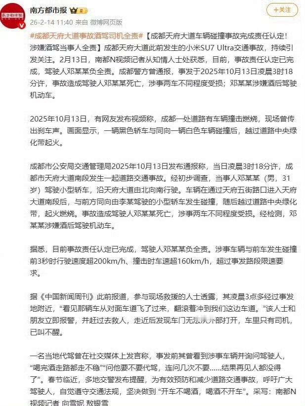 酒驾当事人全责!小米SU7成都碰撞事故完成责任认定