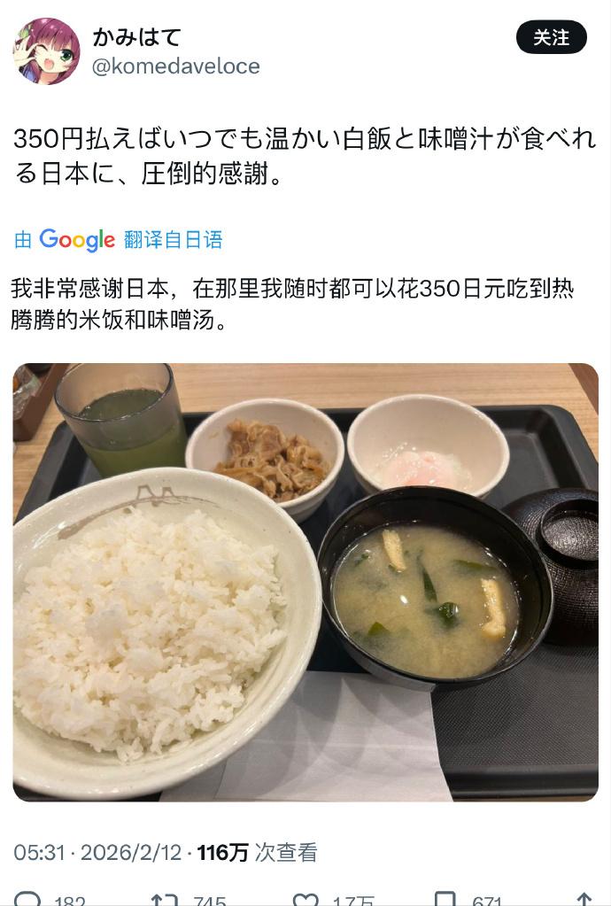 350日元大约可以兑换 15.86元人民币,所以,日本人花16块吃碗白米饭加免费的紫菜蛋花汤和小咸菜还感恩上了? 在咱们这儿,这饭钱也就是个买主菜后送的配餐水平。 先说这350日元的饭。确实,单看这顿饭,似乎分量不大,但咱们得看人家的收入水平。 日本2026届应届生的平均起薪是月薪25.42万日元,这是日本经济新闻社2025年4月的调查预测数据,目前这届毕业生还未完全就业。 这350日元的饭钱,对有稳定收入的日本上班族来说,也就相当于咱们花个几块钱吃顿饭的概念。 按这个购买力算,这顿饭能吃上33顿多,一天一顿,月底还有富余。从这个角度看,这饭吃得不算贵,也就能理解人家为啥能心怀感恩了。 但这只是问题的一个方面。咱们再看看另一个方面,那就是日本的物价,特别是食品价格,这些年可是涨得厉害。 就说这米饭的原料大米吧,2026年年初,日本零售超市里5公斤装普通粳米,平均能卖到4337日元,约合人民币194元,是2023年初的2.3倍!这涨幅可够吓人的。 有日本民众就抱怨,米价太高,家里不得不减少吃米饭的次数,改吃面食了。这可不是个例,日本的民生压力,从恩格尔系数上就能看出来。 所谓恩格尔系数,就是食品支出占家庭总支出的比重。2025年,日本两人以上家庭的恩格尔系数达到了28.6%,创下了1981年以来44年的新高。 原因主要有两个。 一是日本资源匮乏,食品高度依赖进口。按卡路里供给口径计算,日本食品进口占比约62%,日元一旦贬值,进口成本就会大幅增加,物价自然就跟着上涨。 二是工资涨得没物价快。虽然名义工资涨了点,但扣掉物价上涨的因素,2025年日本的人均实际工资反而减少了1.3%,而且这已经是连续4年下滑了。 挣得没花得多,购买力缩水,日子当然就紧巴。 咱们再把这两个方面合起来看。一方面,一顿350日元的饭,对有稳定收入的上班族来说,负担不重;另一方面,整体物价飞涨,特别是大米这种必需品价格翻倍,又让普通家庭感到压力山大。 这两者并不矛盾,它反映的是日本社会的一种现实:对于有稳定高收入的人来说,生活还能维持;但对于普通工薪阶层和老年人来说,物价上涨带来的冲击是实实在在的。 所以,咱们看问题不能只看一面,得全面地看,辩证地看。 前些年,咱们国内有些地方也出现过“蒜你狠”“姜你军”的情况,大蒜、生姜价格飞涨,老百姓直呼吃不起。那时候,大家是不是也感觉生活压力变大了? 虽然咱们整体生活水平在提高,但某些生活必需品的价格波动,确实能直接影响到咱们的幸福感。这和日本现在的情况,是不是有几分相似? 所以,咱们看日本这碗米饭,不能只看它便宜,还得看它背后的民生账本。这账本上,记着收入,也记着支出;记着富裕,也记着压力。 咱们自己过日子,也是一样,得精打细算,量入为出。对于国家来说,保障民生,稳定物价,让老百姓能吃得起饭,过上好日子,才是硬道理。