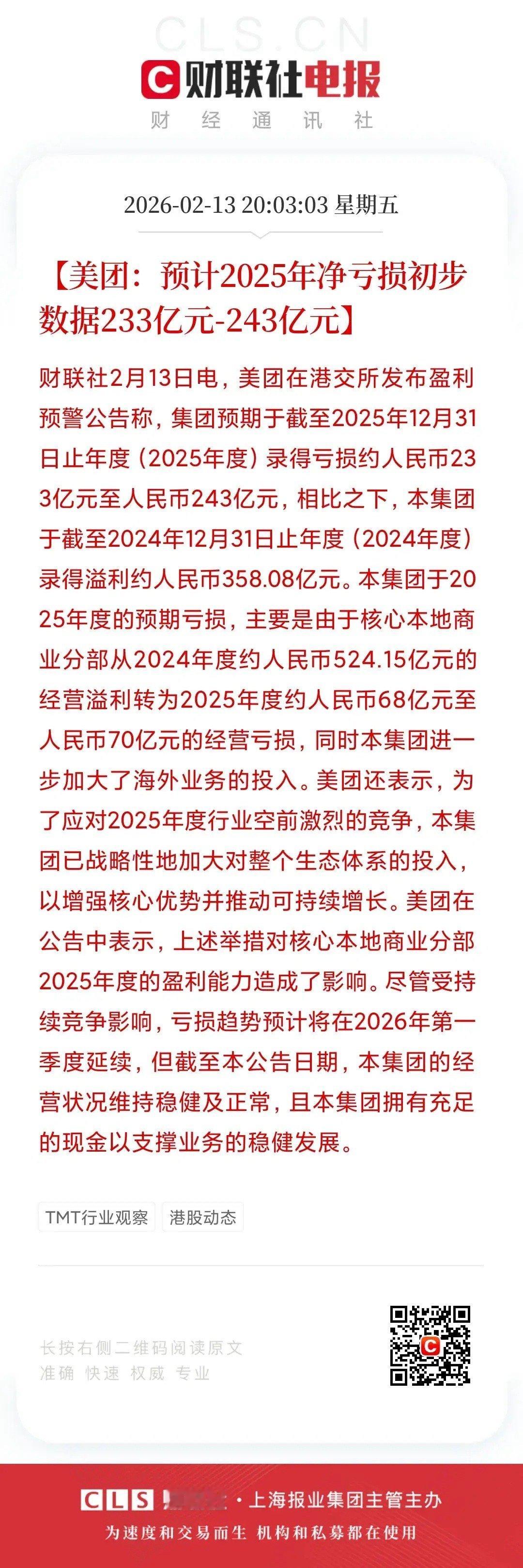 刷到这条公告的时候,我群里有个哥们儿发了一句话:“王兴要是真烧赢了,我就是元老级股东。要是烧输了,我就是被‘战略性’掉的散户。”精准。所以这是一份怎样的盈利预警?是坏消息吗?是。243亿,任谁都得皱眉头。但它同时也是一个宣战书:我承认战况激烈,但我没打算退。用利润换空间。用今天换明天。
