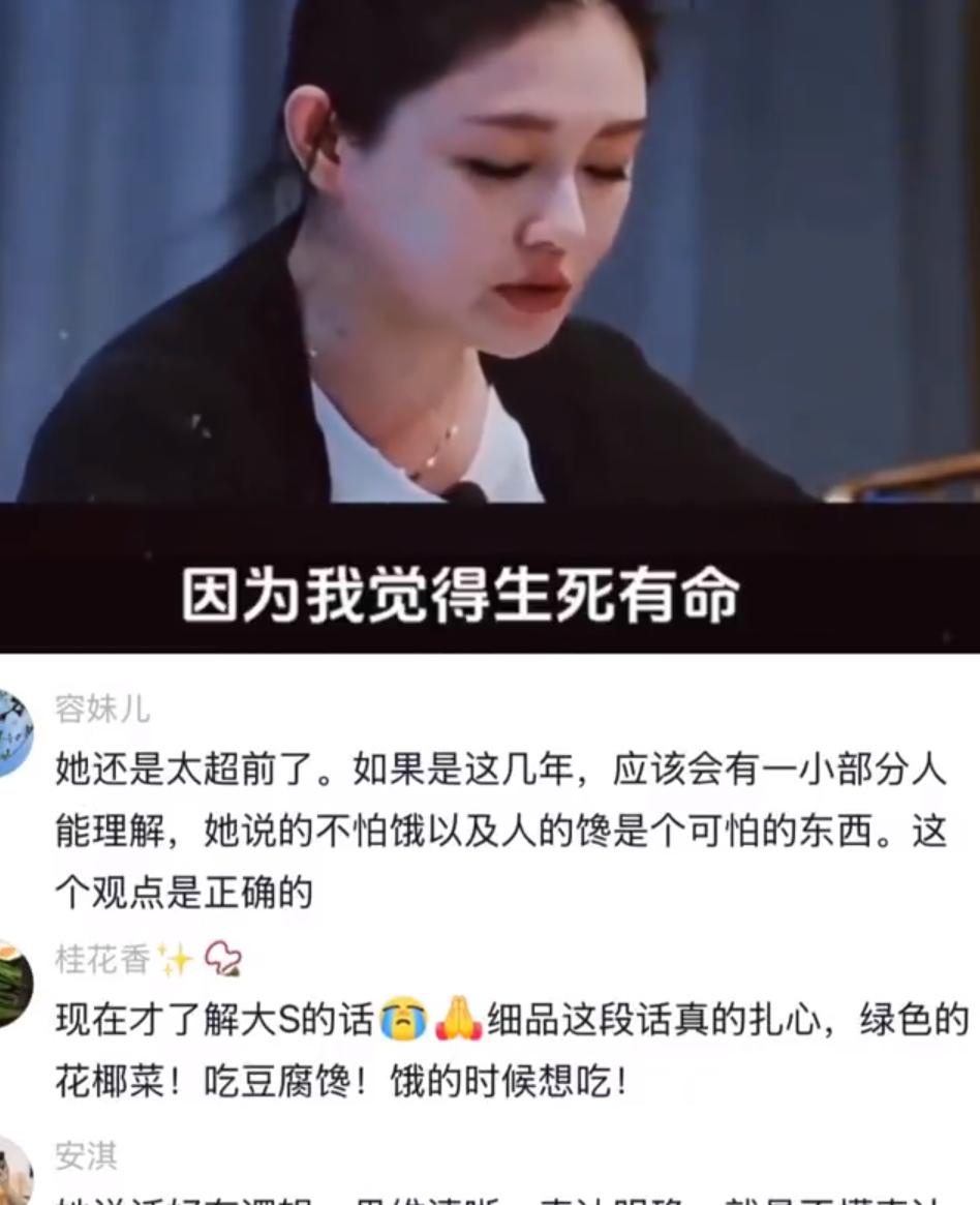 大s对于生死的事情,其实早就看开了,她自己都说了,生死由命 ,富贵在天 当时看这段的时候,就觉得言语中并不是在随便谈谈,到后来和孩子电话哭了,就觉得录节目期间应该有很重的心事,没人理解没人在乎。还有中途有小s来救场,给她精神寄托和安慰 她那时候很虚弱,因为刚小产,因为激素不平衡,所以情绪也不稳定。 那时候我还在感叹珊从一个那么爱美,连头发都不肯被碰的人。居然也剪短了头发,也胖了。未婚前精神充沛,那时候却感觉很虚弱。后来才知道原来录制的前,她刚刚小产这段婚姻带走她太多东西了 当初看她在这节目就觉得她过得很累。很难想象她是一个那么爱美的女明星,想复出工作面对的这些焦虑,还有一个并不能理解自己的另一半是怎么过来的。 之后都没法听她这样慢条斯理的谈论一件事了。 得知她去世的时候我在深圳的一个商场逛街,打开微博的瞬间,感觉不真实。虽然只是一个素未谋面的人,但又觉得如此熟悉,好像是一个不常见面的亲戚。 我觉得,她能得到这么多人的喜欢,肯定是有自己独特的人格特质的