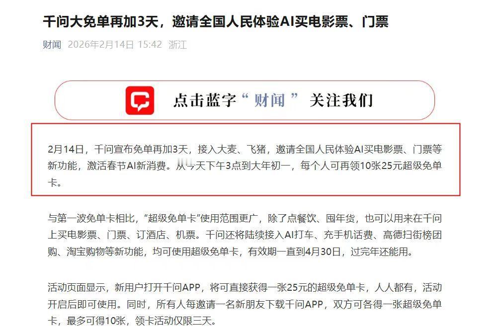 不会还有人不知道吧,千问又出新招了! 之前千问推出免单卡,请全国人民喝奶茶,有多火爆相信大家都是知道的。 只能说真诚就是必杀技,没有任何套路的免单,确实很香。 当然,可能还有人觉得不过瘾,那你别急,千问又放大招了。 千问免单再增加3天,推出了超级免单卡,最高可以领11张,也是非常给力的。 而且这次的超级免单卡真不愧于“超级”二字,使用范围大的离谱。可以用来AI订餐、零食百货、买电影票、买门票、订酒店…… 就连给打车、淘宝购物、充话费,未来千问可能也会实现。 你们就说过不过瘾吧,千问主打的就是怕你不买,不怕你买的多,你不管买什么东西,基本上千问超级免单卡都能用。 换句话说,今年春节你想和家人去看一个春节档电影,直接就能用免单卡,你说香不香?