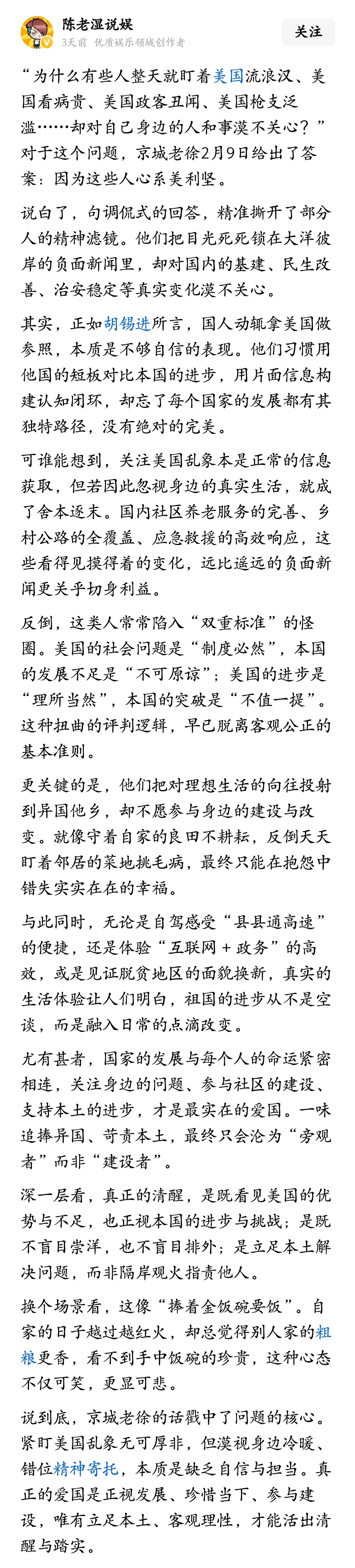为什么有些人整天就盯着美国流浪汉、美国看病贵、美国政客丑闻、美国枪支泛滥……却对自己身边的人和事漠不关心?