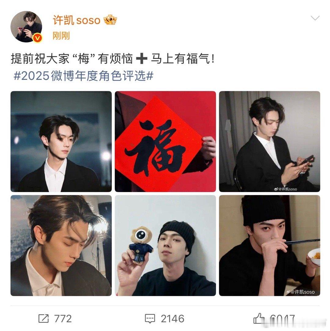 许凯情人节营业许凯祝大家马上有福气许凯情人节营业啦!“提前祝大家“梅”有烦恼➕马上有福气!”~接到祝福!许凯情人节晒照