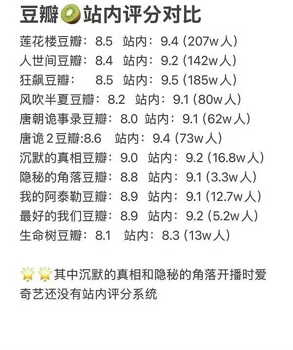 豆瓣和爱奇艺站内评分对比