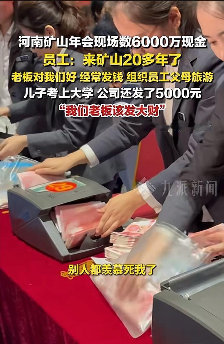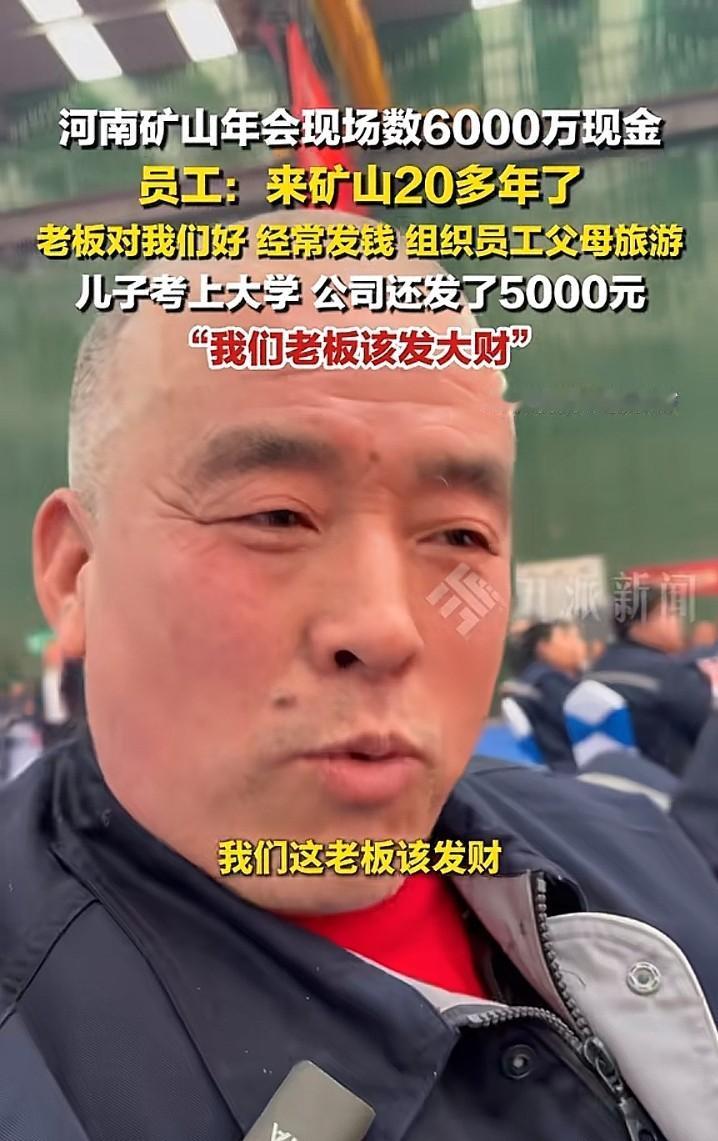 河南矿山年会上,一位干了整整20年的老员工对着镜头满脸骄傲:“我在公司都20年了,老板好,年年发钱,公司组织父母去旅游,儿子考上大学还发5000,别人都羡慕死我了!” 2026年,河南新乡长垣市。这里空气里没有任何工业粉尘的味道,全是人民币油墨的香气。 镜头如果拉远一点,你会觉得这不像个年会,倒像个行为艺术现场。70米长的桌子一字排开,上面没放冷盘热菜,而是简单粗暴地堆起了“现金墙”。6000万元现钞,就这样赤裸裸地冲击着在场每个人的视网膜。 在这座“钱山”旁边,蹲着一位工龄20年的老员工。他脸上虽布满皱纹,却对着镜头笑得格外开怀,满心欢喜地说着心里话:“儿子考上了大学,家里的生活也越来越好,身边不少人都特别羡慕我现在的日子。” 这听起来像是在炫耀,但如果你翻开这家企业2024年的账本,会发现这根本不是什么土豪撒钱的戏码,而是一场极度精明的商业博弈。 2024年,河南矿山净利润2.6亿元。按照常规商业逻辑,老板崔培军完全可以把这笔钱揣进腰包,或者再去投个新厂房。但他干了一件反常识的事:拿出了1.7亿元分给员工。 分红占比超过60%。当多数制造企业仍在通过控制人力支出提升效益时,这里却选择了截然相反的经营思路。 现场最疯狂的一幕发生在“数钱游戏”环节。规定很简单:15分钟,数对多少拿走多少。有员工手指翻飞,一口气数出近10万元,当场塞进麻袋,转头就和同事平分了。 这种看似荒诞的“暴力分钱学”,换来的是什么?其起重机产品已连续八年位居国内销量榜首,同时远销海外一百三十余个国家和地区,凭借可靠品质与强大实力,在全球市场收获广泛认可。 你以为老板傻?其实他比谁都清醒。这家企业始终坚守着自身的经营理念:坚持独立运营,不谋求公开上市,不借助外部融资,也不依赖银行贷款,依靠自身积累稳步发展。这意味着崔培军不需要看华尔街脸色,不需要给股东画大饼,他只需要对台下这群数钱数到手抽筋的工人负责。 但如果只是发钱,那不过是雇佣关系的“金钱加强版”。河南矿山真正恐怖的地方,在于它签订的不是一份劳动合同,而是一张覆盖员工祖孙三代的“家族契约”。 把时间轴拨回2025年。那年公司调度了77辆大巴,浩浩荡荡拉着4000多位员工的父母下江南。扬州、杭州、上海,六天行程,包吃包住还配医护人员。 这已经是连续第15年(素材中B文提及十几年,结合A文确认为15年)这么干了。对于很多一辈子没走出过河南农村的老人来说,这是天大的事。 更有意思的是那笔每个月雷打不动打入父母卡里的“孝心钱”。200到500元不等,看似不多,但累计下来企业已经支出了1.2亿元。 试想一下,当一个员工想要离职时,甚至不需要老板挽留,家里的父母首先就不答应:“这么好的老板,你往哪儿跑?” 这也正是这家企业人员稳定性始终保持出色的关键所在,其员工留存率长期处于行业高位,远优于业内普遍水平,整体人员流动比例明显低于同行均值。搞定了大后方,就锁死了忠诚度。 着眼于下一代的成长,自2004年起便设立专项助学资金。凡企业职工子女成功考入大学,均可获得相应的学业鼓励资金,以此支持青年学子继续深造、追逐梦想。这笔账算下来,已经砸进去3500多万元,资助了4800名学生。 这种“全家桶”式的福利体系,把员工从单纯的劳动力,变成了企业的利益共同体。 所以在管理上,这里展现出一种极简主义的自信。全厂几千人,不设打卡机,管理规定只有区区12条。 遇到下雪天,公司宣布带薪休假并发放防滑补贴。结果发生了什么?大部分员工反而主动跑到车间干活。因为在他们心里,这机器转出来的每一个零件,都有自己的一份红利。 这种信任成本的降低,是任何精密KPI都算不出来的。 在年会的喧嚣散去后,你会看到一个极具反差的画面:老板崔培军脚上踩着那双标志性的20元布鞋,端着一碗河南烩面吸溜着。 不远处,那位身着统一工装、业绩出众的优秀员工,正小心翼翼地捧着大额奖励,缓步走下舞台。 这一刻,传统的雇佣理论失效了。这里没有复杂的职场PUA,没有精致的PPT汇报,只有最原始也最有效的交换:你给我真心和利润,我给你卖命和业绩。 在这个很多老板都在研究如何用算法困住员工的时代,河南矿山用一堵6000万的现金墙给出了另一个答案。 正如那位老员工所说,这不仅是让人羡慕,更是让人不得不服。毕竟,人心这笔账,从来都是最贵的。 参考信息:2月13日,河南矿山年会现场数6000万现金,河南矿山员工称老板该发大财:来矿山20多年了,老板对我们好,经常发钱。2026-02-13 20:07九派新闻