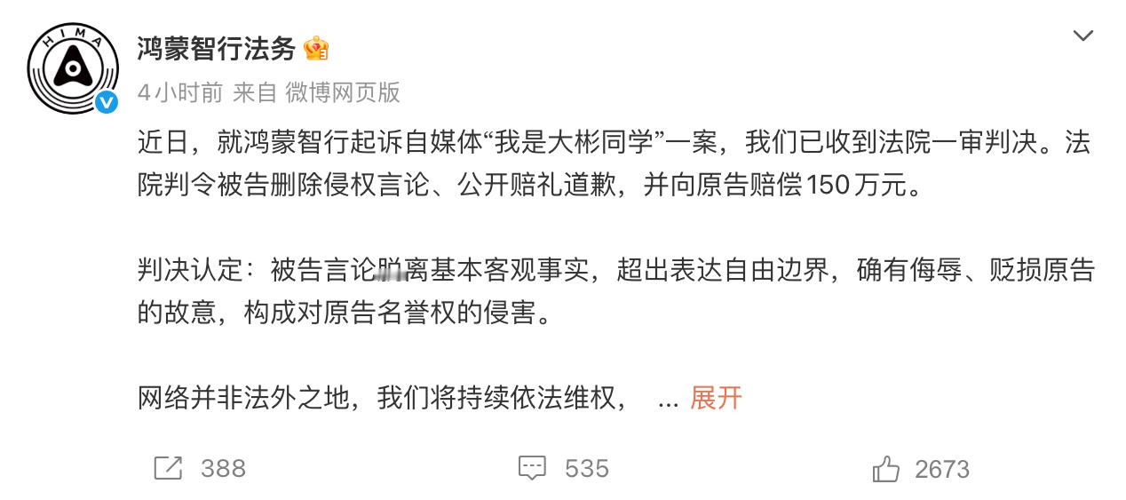 鸿蒙智行诉“我是大彬同学”案一审胜诉:获赔150万。