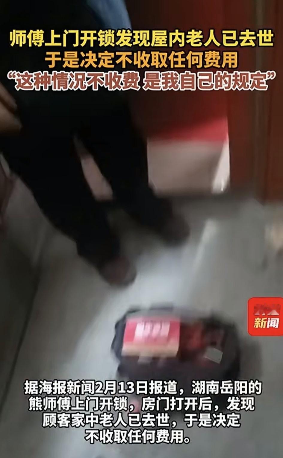 湖南岳阳,一开锁师傅接到一单开锁生意,可师傅上门开锁,将房门打开后,竟发现顾客家中的老人已去世。见此情形,开锁师傅当即决定不收取任何费用。而顾客对此也是非常感激师傅。 据师傅表示,当时是因为老人家属给家中老人打电话,但老人却始终没接,于是家属便准备上门查看一下情况,结果门也打不开了,于是家属只得请来师傅开锁,不料却老人在家里过世了。 关于为什么不收费,师傅也解释说,他给自己定了一个规矩,那就是开完锁发现老人家过世了,一般这种情况都不会收取任何费用。 不得不说,大过年的遇到这样的事,确实让人心里五味杂陈,希望逝者安息,生者节哀。不过师傅确实是个善良之人,他这么做不只是遵守自己的规矩,更是对逝者及家属最大的尊重,他用自己真诚送了老人家一路走好! 也正如网友所说,任何行业做任何事情,都要有底线知敬畏,这样才会越来越好,而师傅做到了,而且做得很暖心,如此懂规矩有良心的师傅值得大家尊敬!必须为他点个赞!