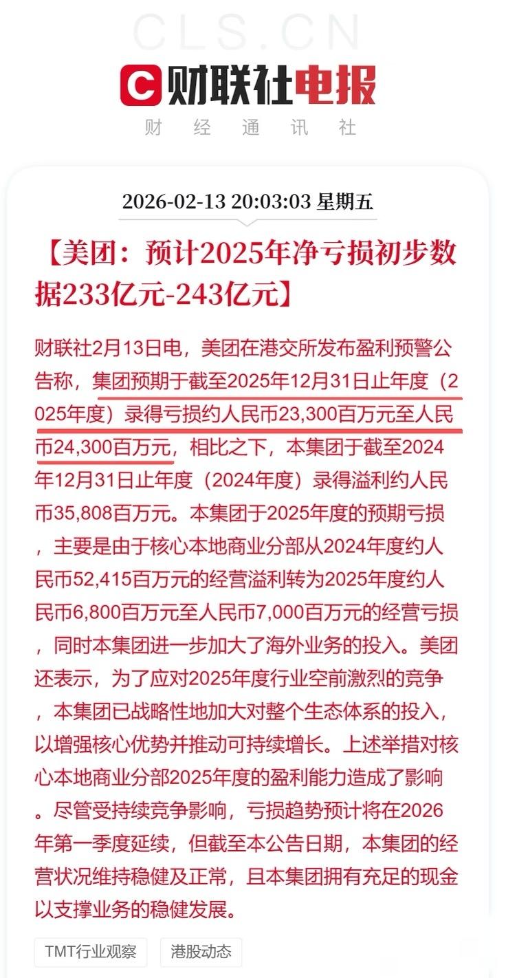 美团:预计2025年净亏损233亿元-243亿元 别担心,国内互联网企业接下来利润都不会好到哪儿去,阿里和腾讯已经开启2026年的补贴大赛了。可惜他们这些资本支出都只是为了圈一些流量和用户,在AI时代下这些价值并不是最高的资产。