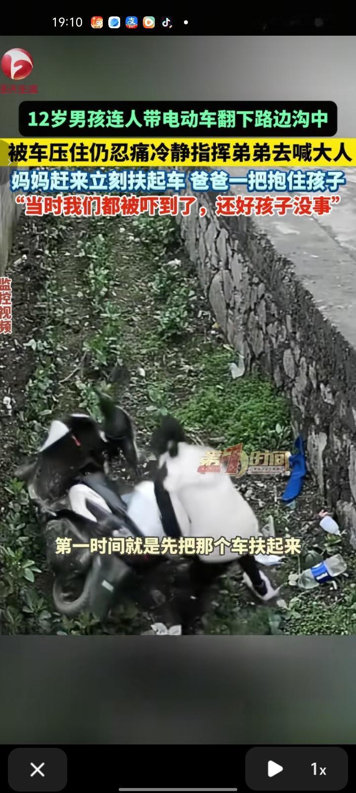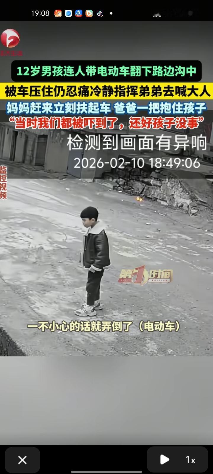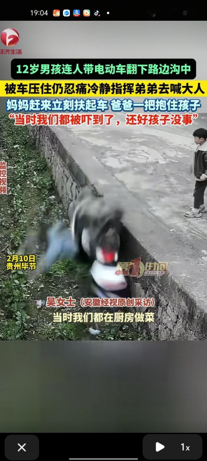 2月10日,毕节黔西市。12岁男孩连人带电动车翻下路边沟中,此时家人在厨房做饭没听到声音。男孩被车压住后,忍痛指挥弟弟去喊妈妈,妈妈听到弟弟的叫声,第一时间就把车扶起来,然后爸爸一把抱住孩子。好在男孩没受伤,只是下嘴唇有点擦伤。