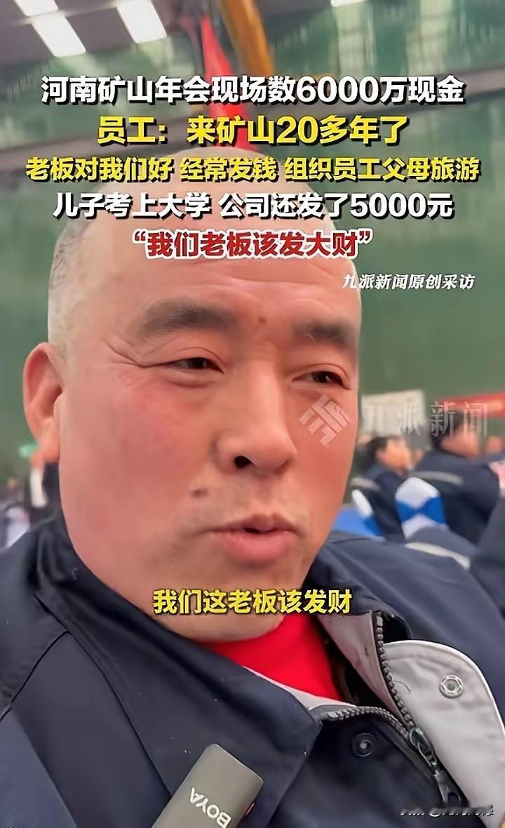 河南省的良心企业家真多,以前知道有个胖东来,对员工非常好,现在又知道了河南矿山集团,崔老板对员工更是好,拿员工当亲人一样看待,这样的老板能不发大财吗?对于这样的良心老板,不管他挣多少钱,一点都不嫉妒,反倒是希望他挣得越多越好,他挣得越多,对社会的贡献就越大!