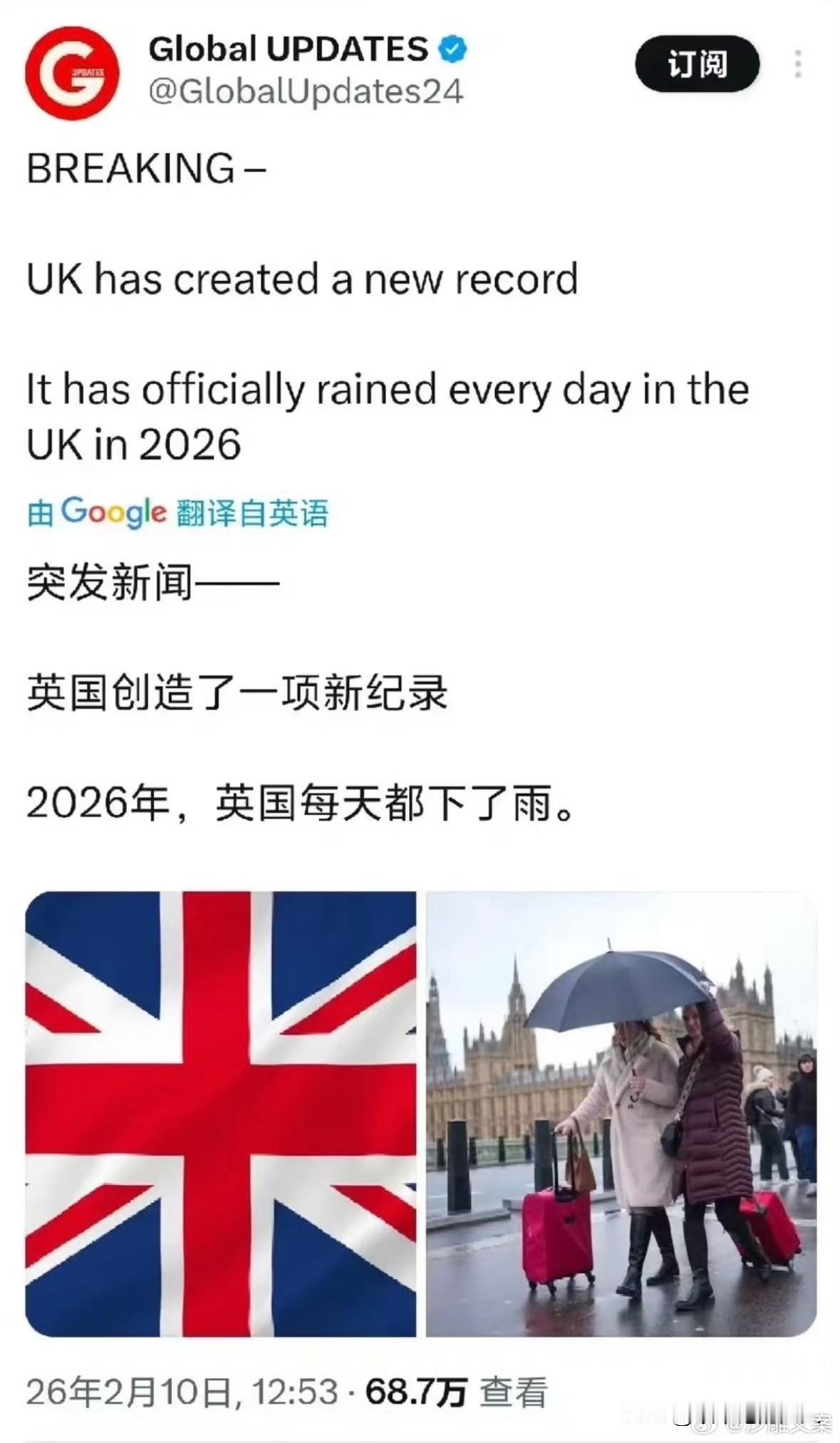 真的假的? 2026年来,英国每天都下了雨?[捂脸] 要我说,那一定是风向变了, 所以,天天下雨呗!