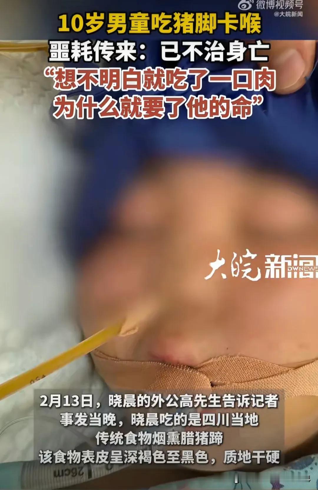 太不幸了!10岁男孩吃猪脚被卡喉后续来了,妈妈无比悲痛、至今都想不明白“就吃了一口肉,为什么就要了他的命。” 据悉,男童吃的是四川当地传统的熏腊猪蹄,质地干硬。 孩子送到医院抢救20分钟后,便因窒息时间过长陷入重度昏迷。10日后,脑部及多脏器严重受损,抢救无效死亡。 此前其家属讲,孩子在沙发上玩平板,他妈妈随手给他拿了一小块刚煮好的猪脚,不料就被卡住了。发生这种惨事,谁也想不到,而熏腊猪脚是当地人经常吃的美食。 小编认为,这最大的问题不是这猪脚,而是人们的生活习惯发生了变化。现今有多少人吃饭不玩手机的? 吃饭看似是本能,可不正当的姿势、吃饭时狼吞虎咽等等,都是会影响人的后天之本——脾胃健康。 食不语、寝不言,不是老祖宗的古板说辞,而是基于人体健康的养生智慧。