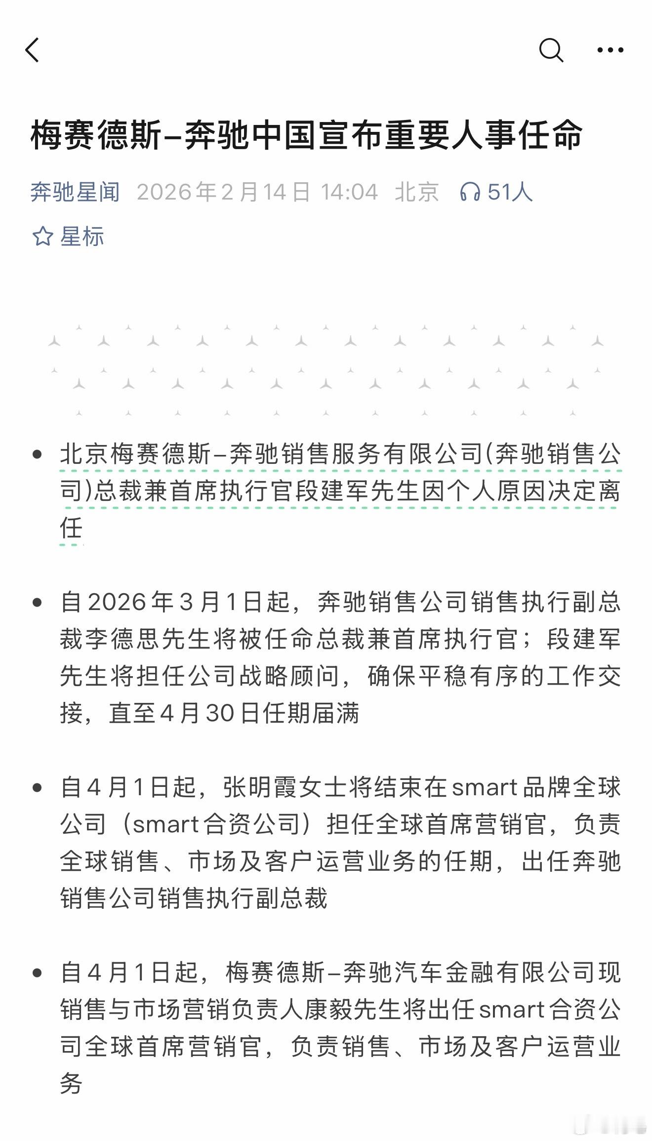 梅赛德斯-奔驰中国,这下把奔驰和Smart 的高管换了好几个………过年前果然各家