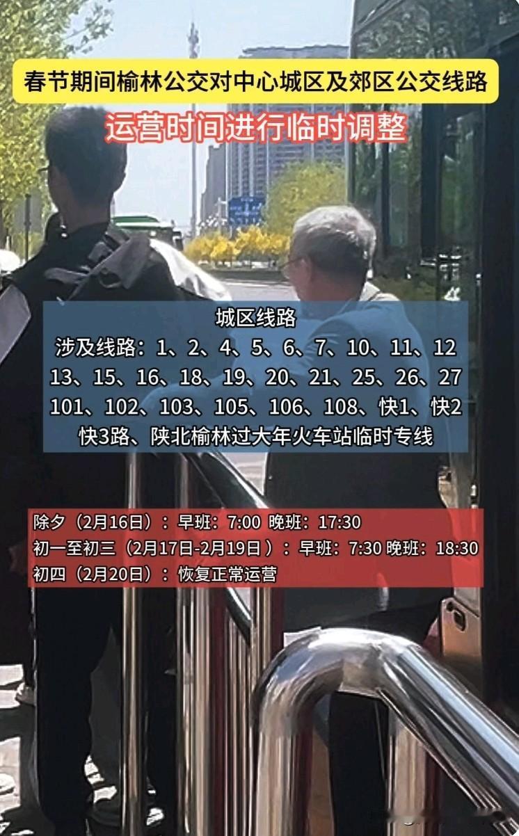 榆林人春节坐公交的快看!免费专线+运营时间全更了,别跑空! 家人们,春节出门不用愁打车贵了!榆林公交直接开了免费专线,机场、火车站直达市区热门地,全程不花一分钱,也整理好运营时间了,赶紧码住! 💥免费专线太香了(2.12-3.4陕北榆林过大年期间) ✅机场专线:早8点到晚8点,榆阳机场→汽车北站→钟楼巷,逛吃超方便 ✅火车站专线:早6:50到晚20:30,火车站→万达广场→阳光广场 无任何凭证,直接上车就行! ⚠️靖边公交划重点!运营时间大调整 ▫️2.16除夕-2.18初二:直接停运营3天 ▫️2.19初三-2.22初六:早8:30到晚16:00,只开一半车 ▫️2.23初七:早8点到晚17点,恢复全部车辆 ▫️2.24初八:彻底恢复正常运营 还有省一冬会(2.5-2.11)也有免费专线到体育中心,来榆林观赛、玩的朋友也能轻松坐! 春节出门坐公交的,别记混时间白跑一趟!赶紧收藏转发,给身边的家人朋友提个醒~ 春节免费乘公交 榆林专线 榆林包车 榆林旅游包车 榆林神木回程车 榆林汽车时刻表 榆林大巴包车