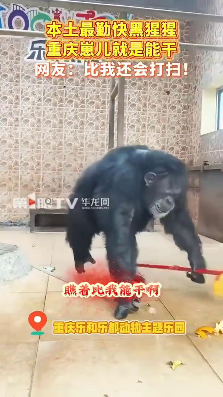 本土最勤快黑猩猩,重庆崽儿就是能干。网友:比我还会打扫。 重庆乐和乐都动物主题乐园。 瞧着比我能干。