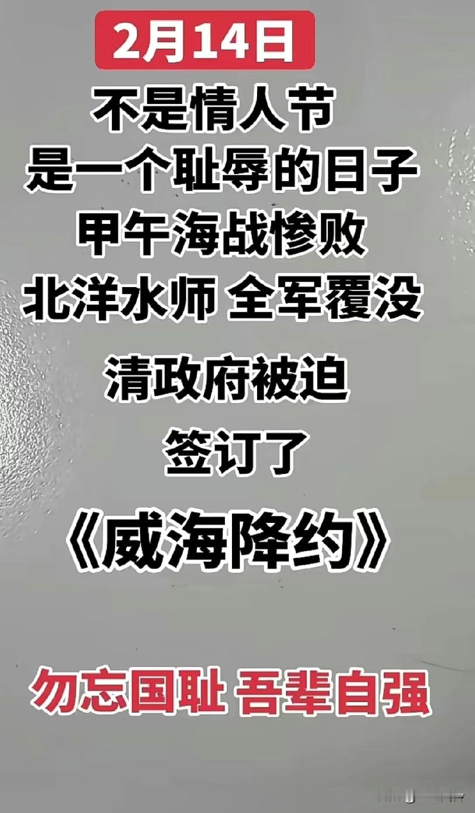 不是情人节是一个耻辱的日子,甲午海战惨败,北洋水师全军覆没,清政府被迫签订了《威海降约》 甲午海战大炮都是掺沙子的,清政府是故意输的,目的就是为了签赔款条约偷中华民族的钱转移到国外,只对可怜蒙在鼓里的水师战士。 中华文化里没有情人节,把一个出轨乱搞的糟粕事情搞成一个节日是哪个人提出来的