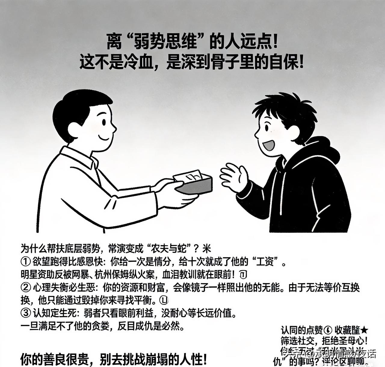 远离有“弱势思维”的人!这并非冷血,而是深入骨髓的自我保护! 为何帮扶底层弱势群体,常落得“农夫与蛇”的结局? 一是欲望超越感恩:一次帮扶是情分,多次就成了对方的“工资”。明星资助遭网暴、杭州保姆纵火案,教训惨痛! 二是心理失衡生恶:你的资源财富会映照出他的无能,无法等价交换,便想毁掉你以寻平衡。 三是认知决定结果:弱者只图眼前,等不及长远价值。满足不了贪婪,反目是必然。 “善良珍贵,别挑战崩塌的人性!” 认同就点赞、收藏!筛选社交,拒绝圣母心。 你有过“升米恩斗米仇”的经历吗?评论区分享。 天道弱者思维 走出受害者思维 维权思维