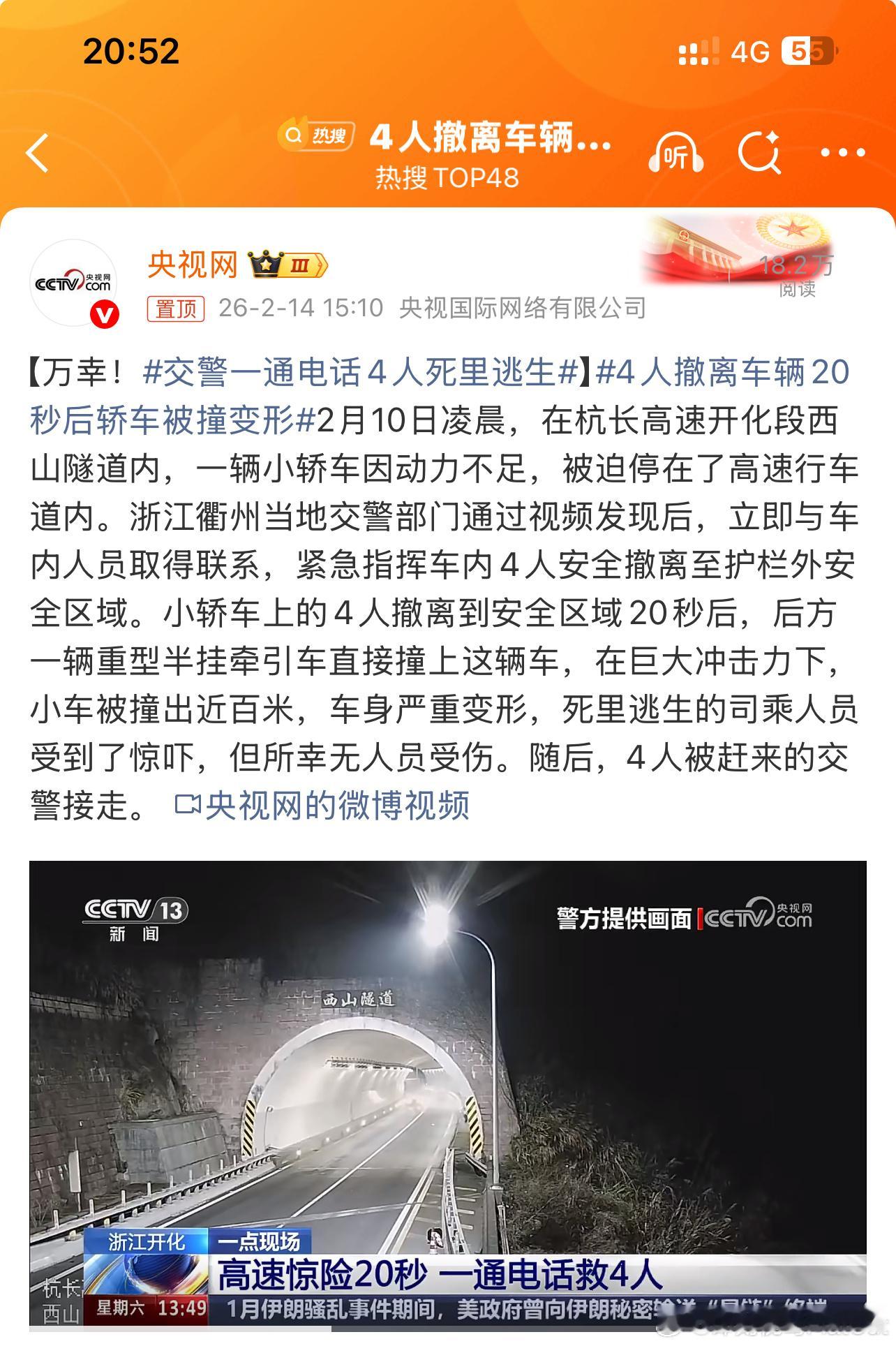 4人撤离车辆20秒后轿车被撞变形这真的是死里逃生所以大家在高速遇到故障一定要撤离到安全区域外因为按照安全规范来是真的会救大家一命