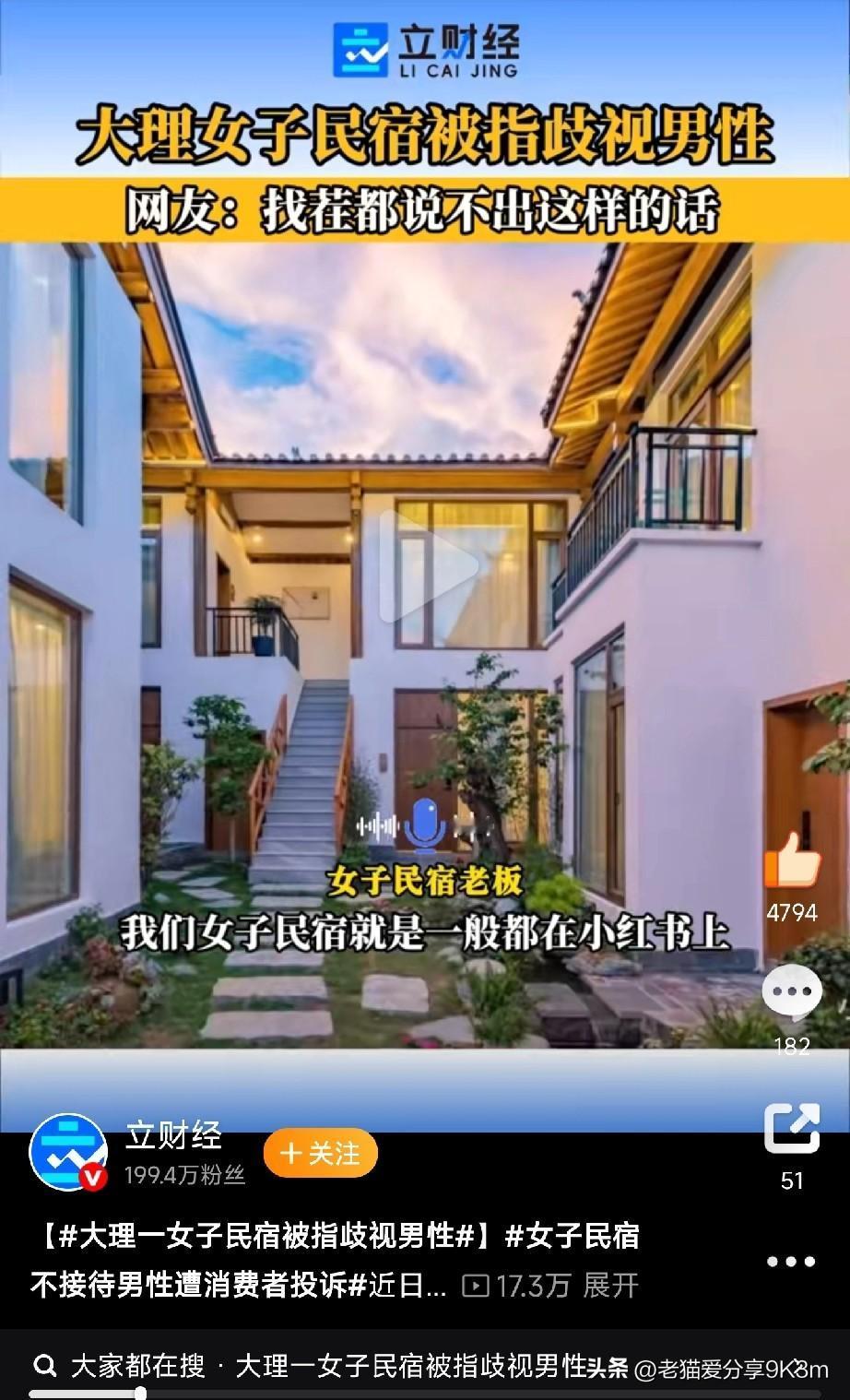 大理一女子民宿被指歧视男性 今天刷到大理一女子民宿的事,直接给我看懵了! 这家主打“女性友好”的民宿,明明白白写着“不接待男性”,结果居然有男的跑去咨询,还被怼“歧视男性”? 老板都无奈了:我们明明写着规则,咋还有人往上凑呢? 原来,有男顾客在平台质问店家:“你们怎么保证‘安心疗愈空间’的安全?”甚至还要求店家提供“安全证明”? 这操作直接让网友炸锅了: ✅ 有网友调侃:“难道还能有人开着坦克去闯一家女子民宿吗?” ✅ 也有网友力挺店家:“规则写清楚了还不懂尊重?换位思考行不行?” ✅ 还有人说:“要是开全男民宿,大家肯定也理解啊!” 店家老板直接回应:我们真不是歧视男性!初心就是给来大理的女生一个能放松、不被打扰的空间。就像女生去女澡堂子一样,图个安心而已。 结果还被扣上“歧视”的帽子,太冤了! 说真的,明明规则写得清清楚楚,非要往上凑还倒打一耙?尊重他人选择很难吗? 开全女民宿≠排斥男性,就像有男澡堂也不代表歧视女性啊!搞不懂有些人到底在杠啥… (文章素材来自立财经,侵删)