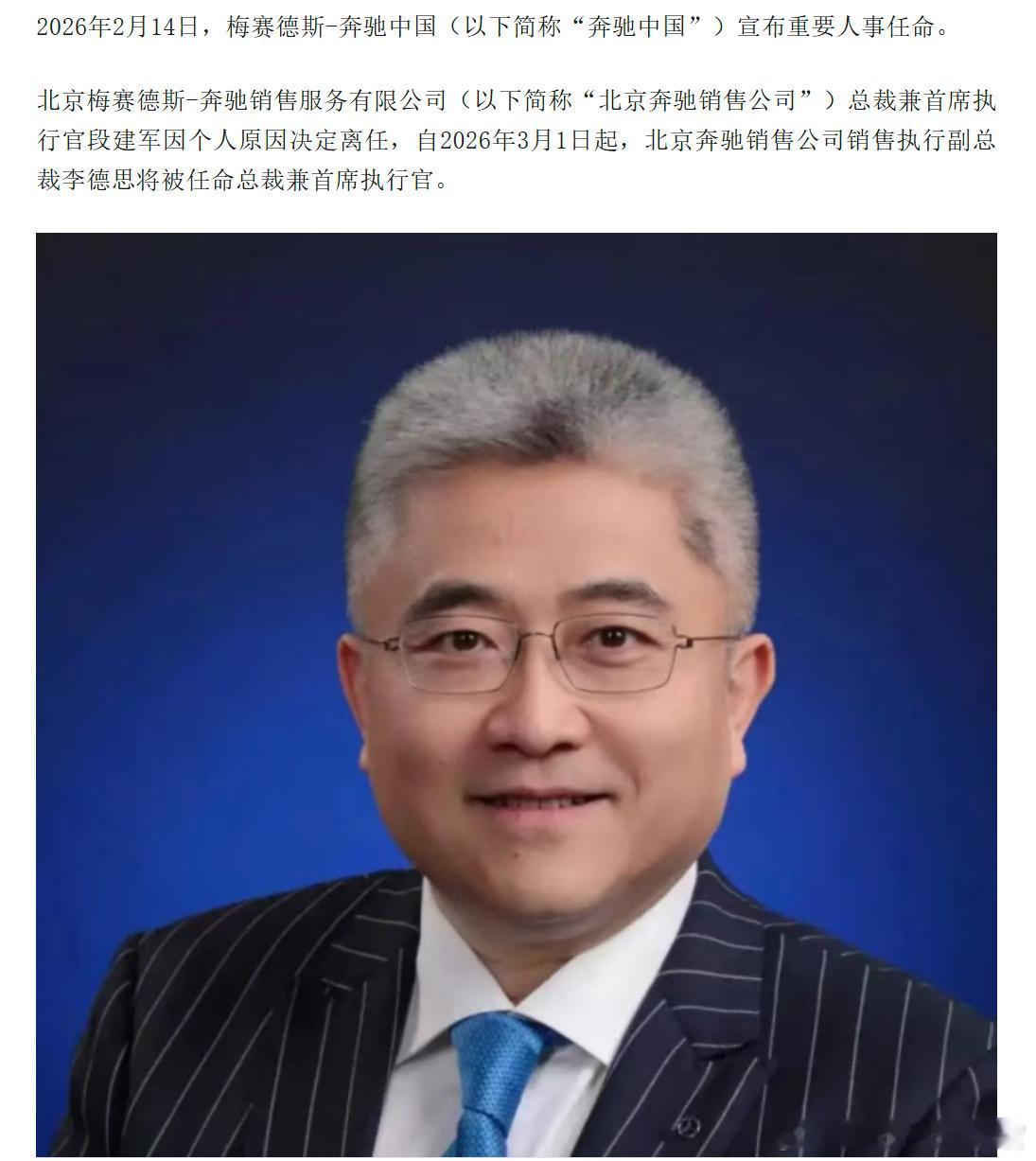 奔驰年前宣布了人事变动:段建军因个人原因离任,李德思接任