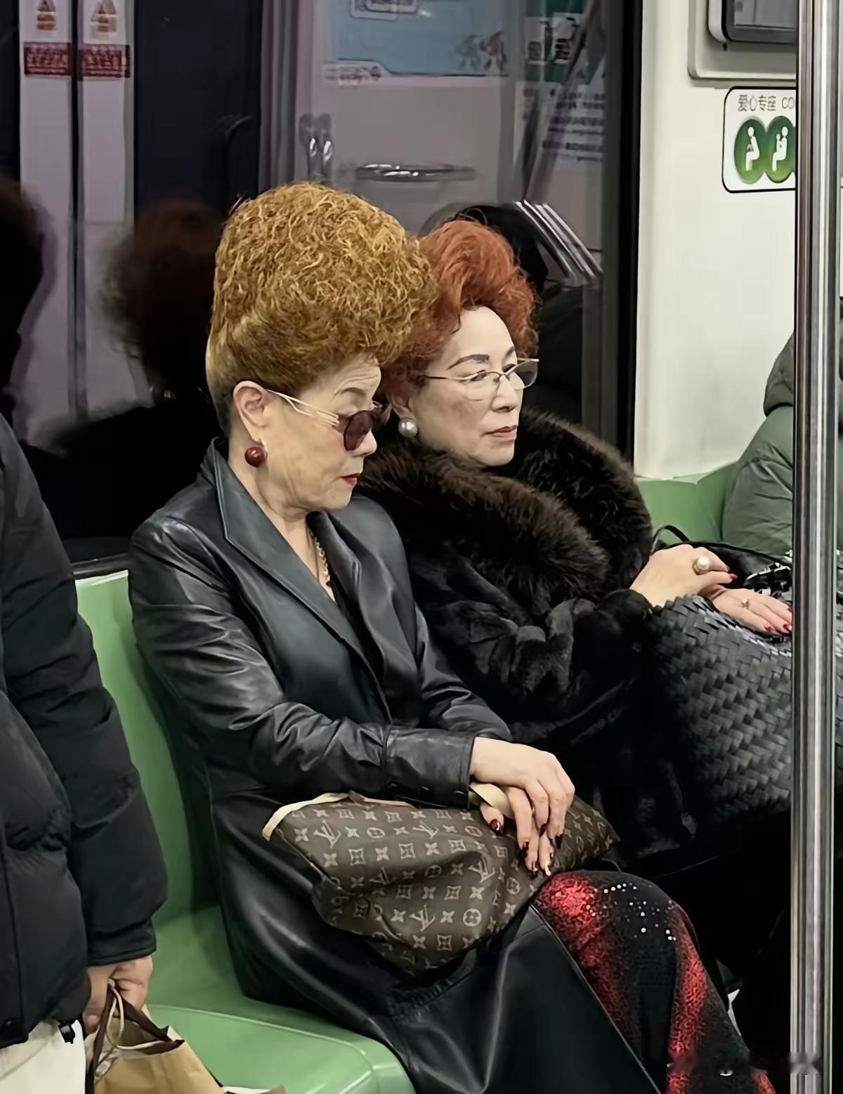 哇塞!瞧瞧这两位大妈的打扮,家里指定有矿吧! 地铁上这两位大妈,穿着十分昂贵,气质也很出众,身上披着貂皮大衣,手里拎着名牌包包,尤其是那一头宛如“金毛狮王”般的发型,一看就知道,不是能轻易招惹的主。 梳这种发型的大多是天津大妈,据说发髻盘得越高,在家里的地位就越高。 看左边那位大妈梳的高高发型,在家里地位肯定不低吧!