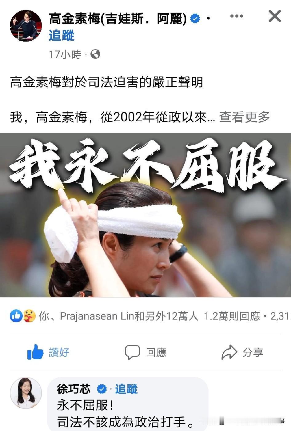 高金素梅百万交保!宣誓永不向赖清德当局屈服! 在岛内旗帜鲜明坚称自己是中国人,向来严肃抨击台湾当局媚日行为的知名资深“立委”高金素梅这两天被台当局以涉嫌诈领助理费和不当医疗器材案被调查,经过48小时高强度疲劳审理,最后高金素梅暂时以100万限制出境交保! 这位岛内“立委”里唯一敢高喊中国人,主张两岸应该统一的女中豪杰如今却面临民进党当局追杀!可叹!