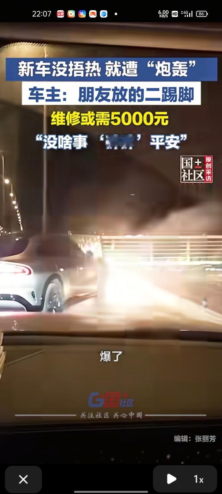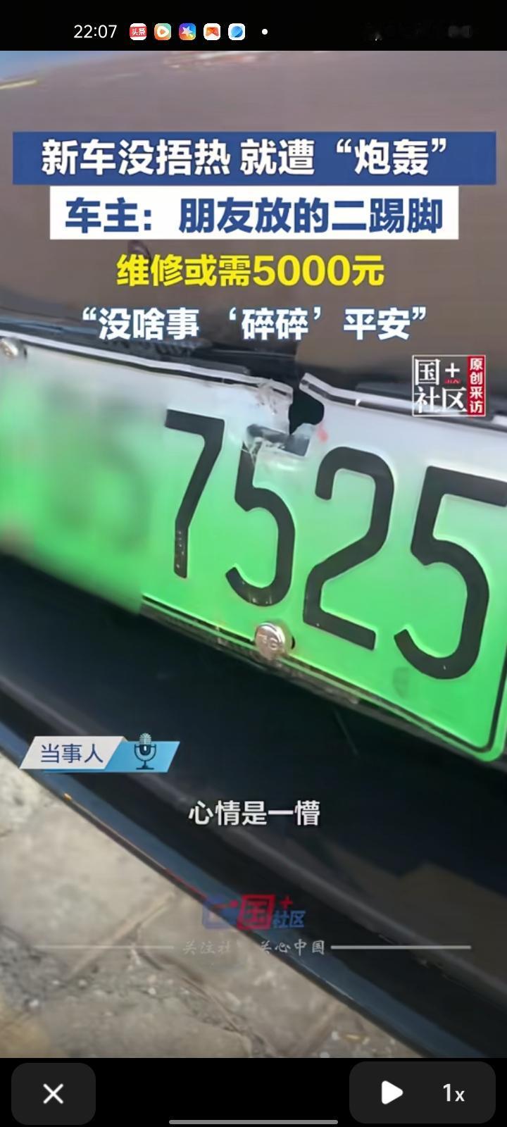 2月11日,内蒙古通辽。小伙买到新车没捂热,就被“炮轰”了,车牌有点受损,或上4S店维修 当事人称,是朋友放的二踢脚,当时车被炸完心情是懵的,因为车刚提来一个多月,大过年的“碎碎”平安吧