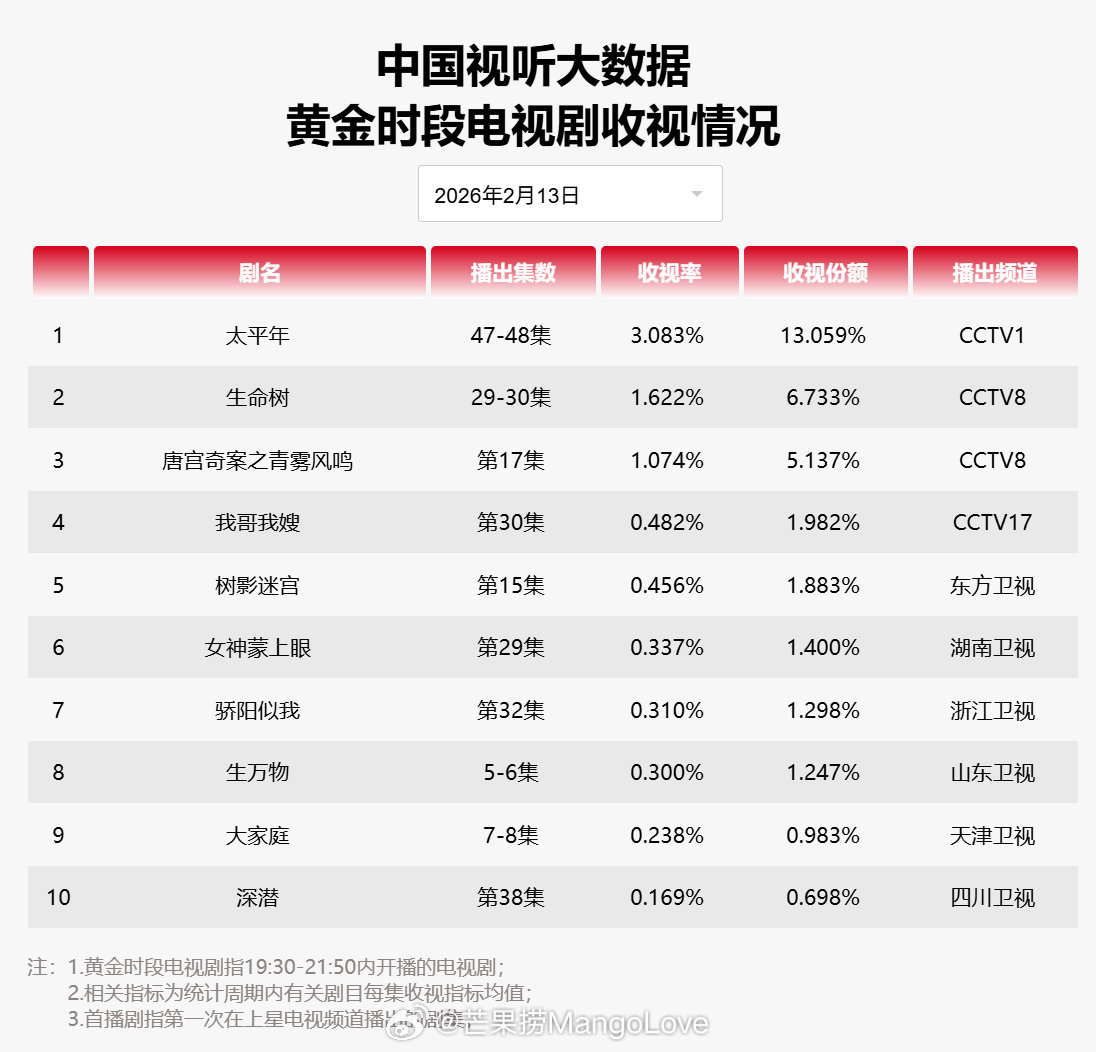 2026年02月13日中国视听大数据CVB黄金档电视剧收视率日榜TOP101 太平年 CCTV12 生命树 CCTV83 唐宫奇案之青雾凤鸣 CCTV84 我哥我嫂 CCTV175 树影迷宫 东方卫视6 女神蒙上眼 湖南卫视7 骄阳似我 浙江卫视8 生万物 山东卫视9 大家庭 天津卫视10 深潜 四川卫视