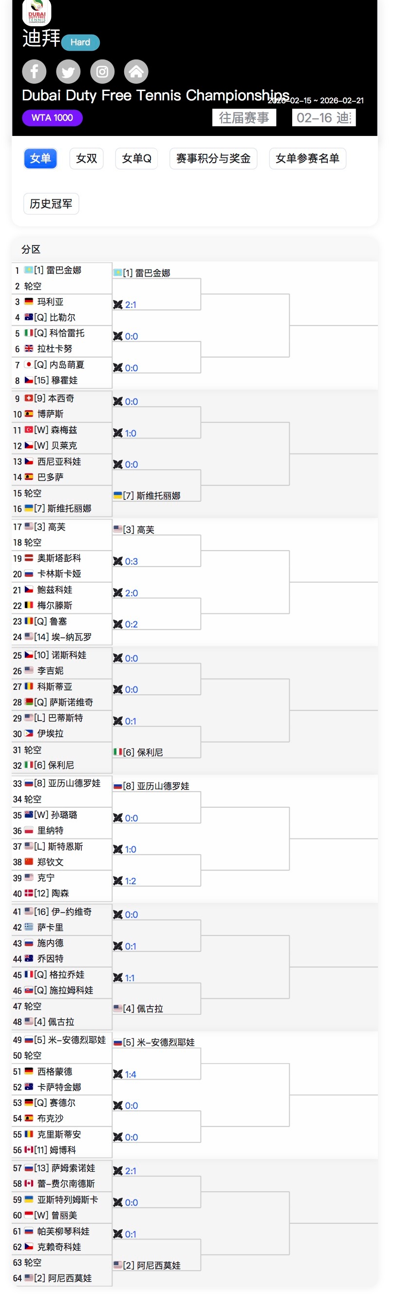 迪拜赛资格赛球员落位,因为有选手退赛,所以斯特恩斯抽中幸运落败者,首轮对阵郑钦文……