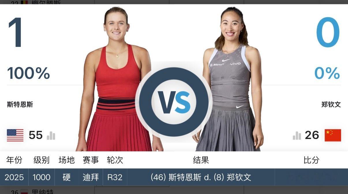 郑钦文连续两年迪拜对阵斯特恩斯郑钦文vs斯特恩斯wta迪拜1000赛