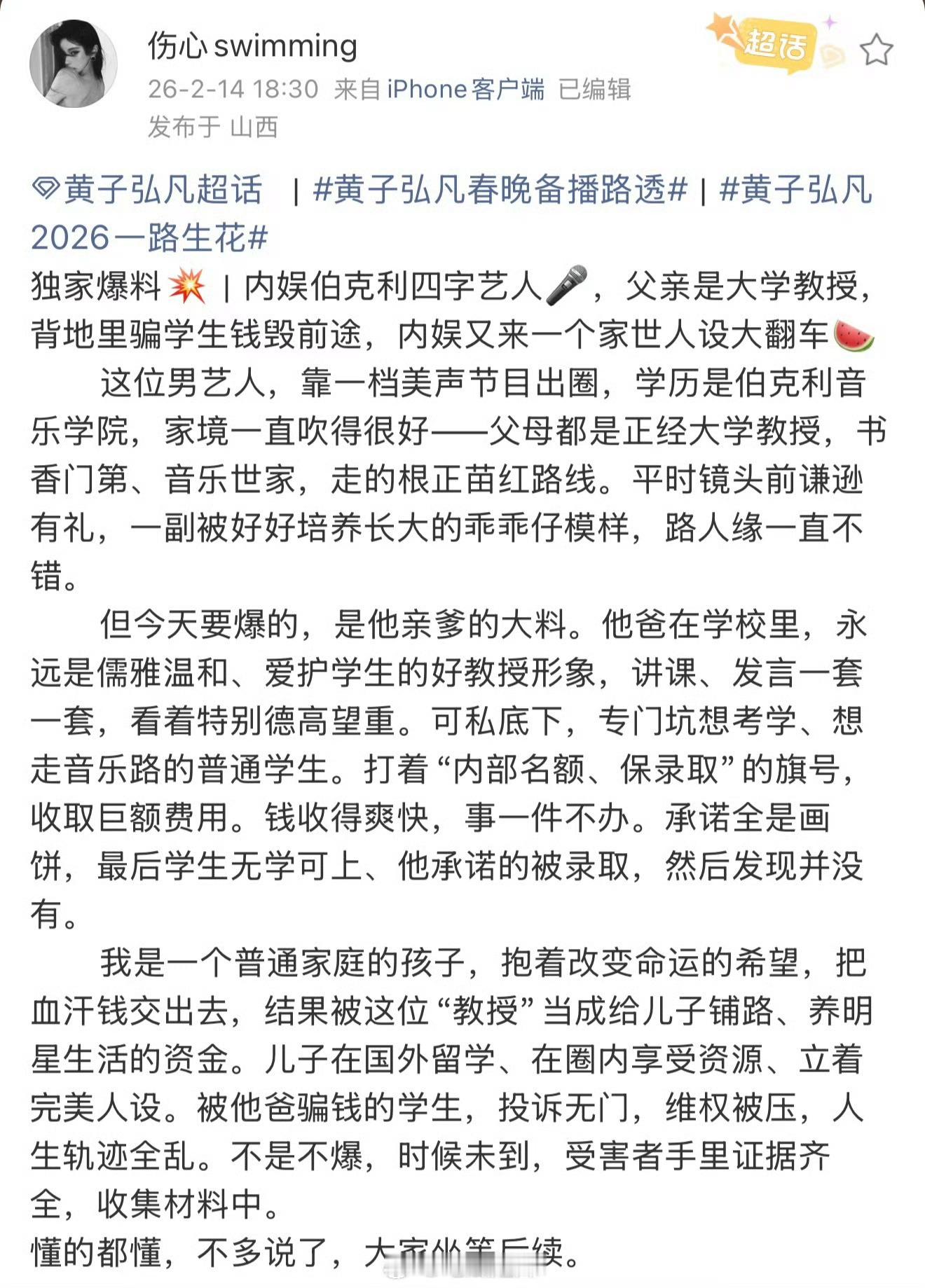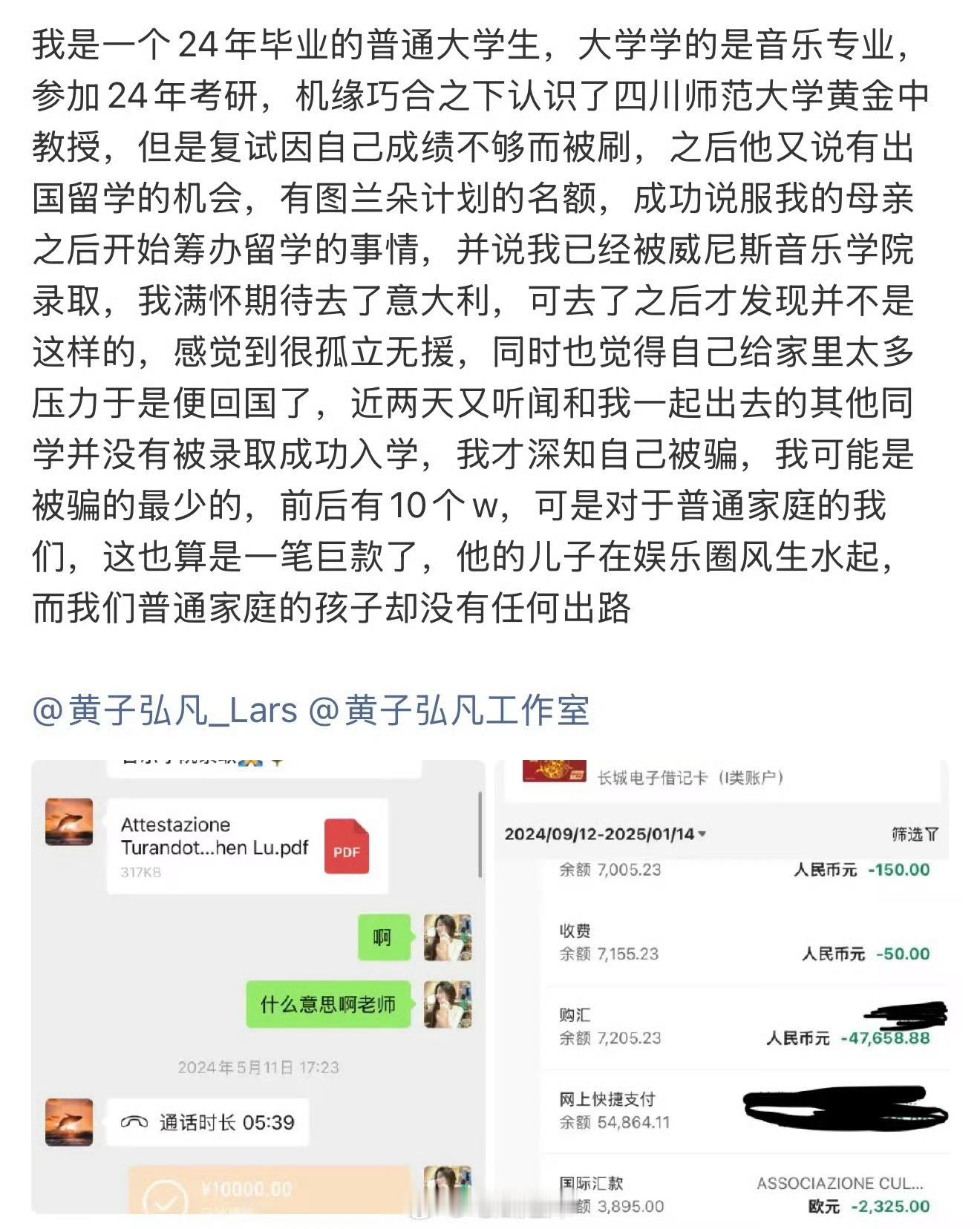 曝黄子弘凡爸爸诈骗学生人家也没必要吧,自己本身优秀 而且自己儿子也很优秀也能赚,也没必要干这种事情吧,是也不能仅凭几张聊天记录就表明什么啊?。对于这件事你们怎么看?