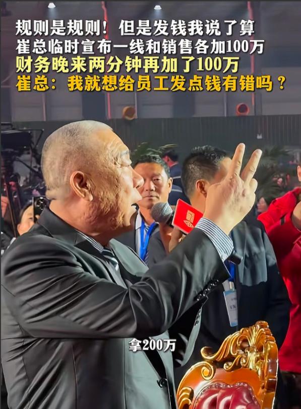 发现没?在河南矿山上班最累的人不是老板,也不是一线打工人,而是这个公司的财务,只因为他们有个爱发钱的老板崔培军。 这个老板发钱太实在,可把财务忙坏了,看着就爽。 别的公司财务,年底把账做好就行。 河南矿山的财务,不光要做账,还得干体力活。 年会上,崔培军当场宣布,一线和销售各加 100 万。 他要求财务,2 分钟就要把钱拿上台。 财务赶紧抬着现金,往台上跑。 就晚了 2 分钟,老板又追加 100 万。 他还笑着问,我就想给员工发点钱有错吗? 网友看了也有不少疑问。 有人问,现场发现金,个税会不会如实申报。 还有人说,为啥不网银支付,取这么多现金银行不限制吗。 财务可得记住这次的经验。 下次提前准备透明胶箱和手推车。 老板一发声,立马拉钱上台,别再耽误时间。 这样一心给员工发钱的老板很难得。 员工干得安心,企业也能越做越好。