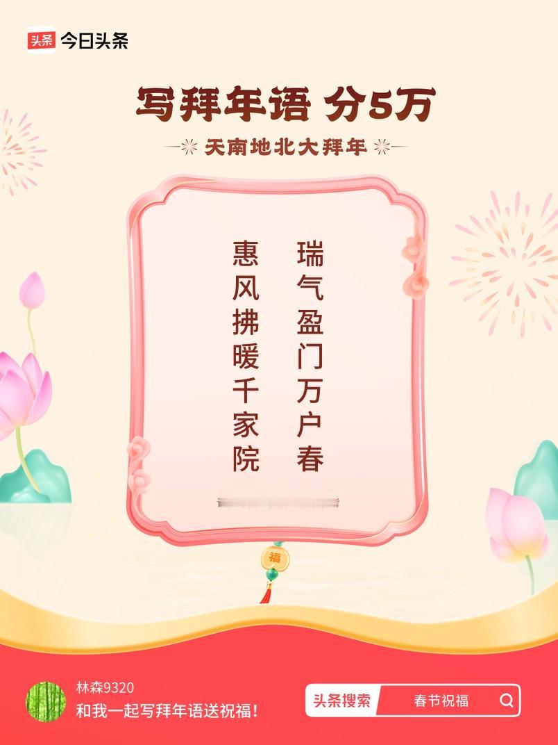 写拜年语送祝福新春拜年送祝福!我的祝福是:“惠风拂暖千家院,瑞气盈门万户春”!快来一起写祝福吧戳这里,一起领红包>