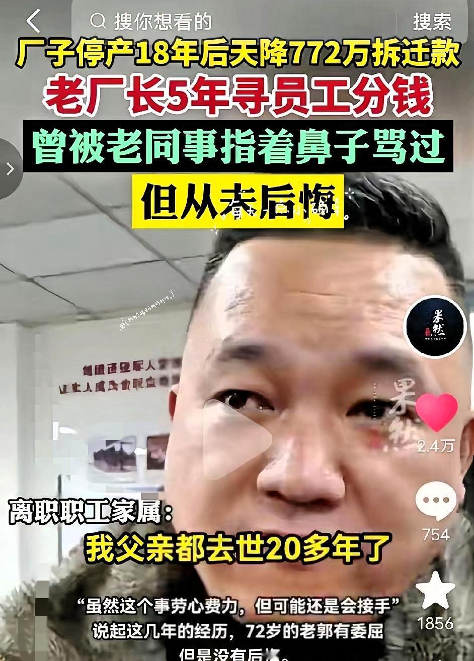 772万拆迁款打进自己账户,停产18年的厂子,人都散完了! 重庆这位72岁老厂长的选择,却看哭无数人! 五年跑遍大半个中国,一笔一笔还给407名老员工,连去世20多年的职工家属,他都亲自把钱送到家门口。这,才是中国人最珍贵的良心与担当! 这哪是简单的分钱,分明是用余生守住做人的底线。在这个快节奏的时代,太多人把利益放在前头,可老郭用行动告诉我们,真正的体面从不是赚多少钱,而是守住良心与担当。他捐出的老账本,留下的不只是一段往事,更是中国人刻在骨子里的诚信,这才是最该被我们记住的人间正气!