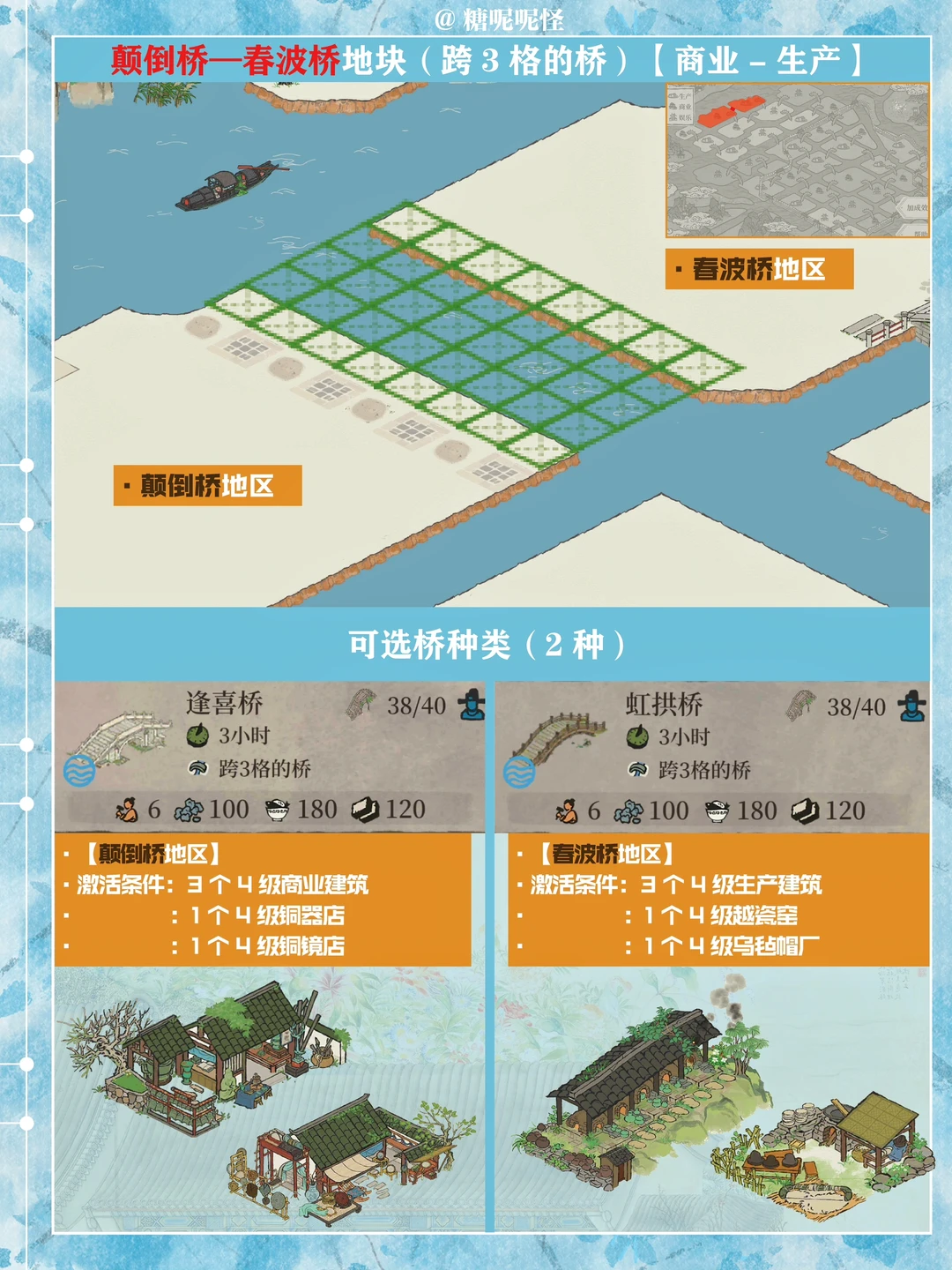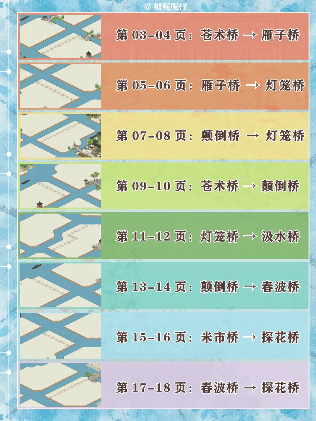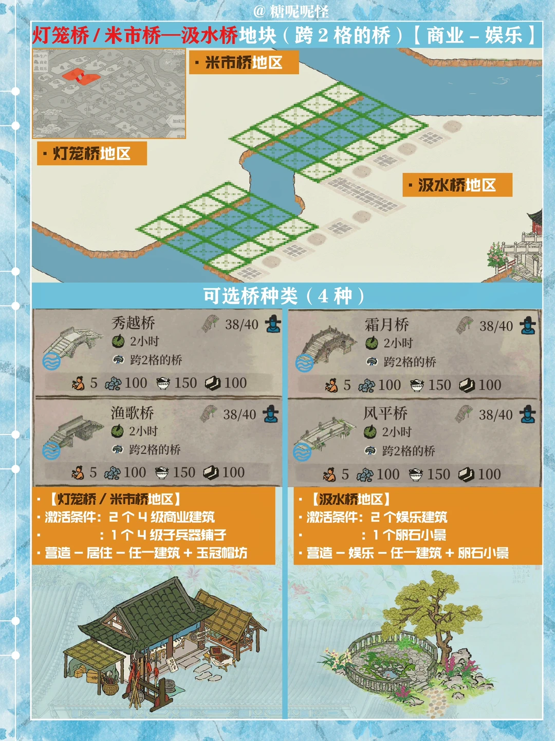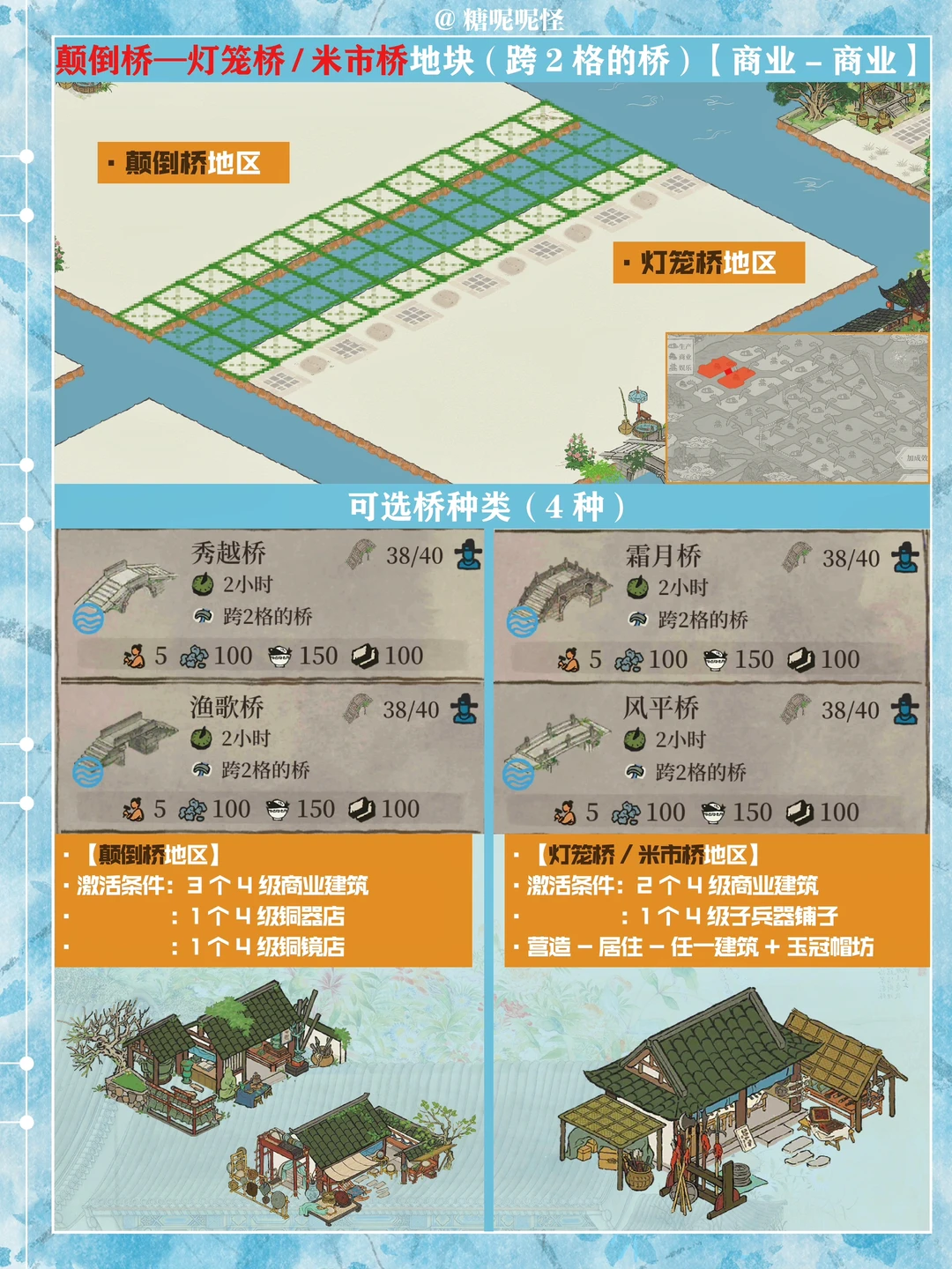 1️⃣此篇包含【苍术桥-雁子桥】【雁子桥-灯笼桥】【颠倒桥-灯笼桥】【苍术桥-颠倒桥】【灯笼桥-汲水桥】【颠倒桥-春波桥】【米市桥-探花桥】【春波桥-探花桥】区域的桥头小装饰汇总。 2️⃣每个地块的激活条件、可用桥梁及小桥装饰小景汇总 3️⃣同一位置放置不同桥梁的时候装饰小景是一样的,可以根据布局需求选择 4️⃣只能放18页图,其他地块的后面发