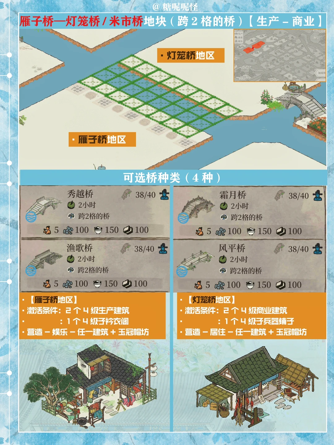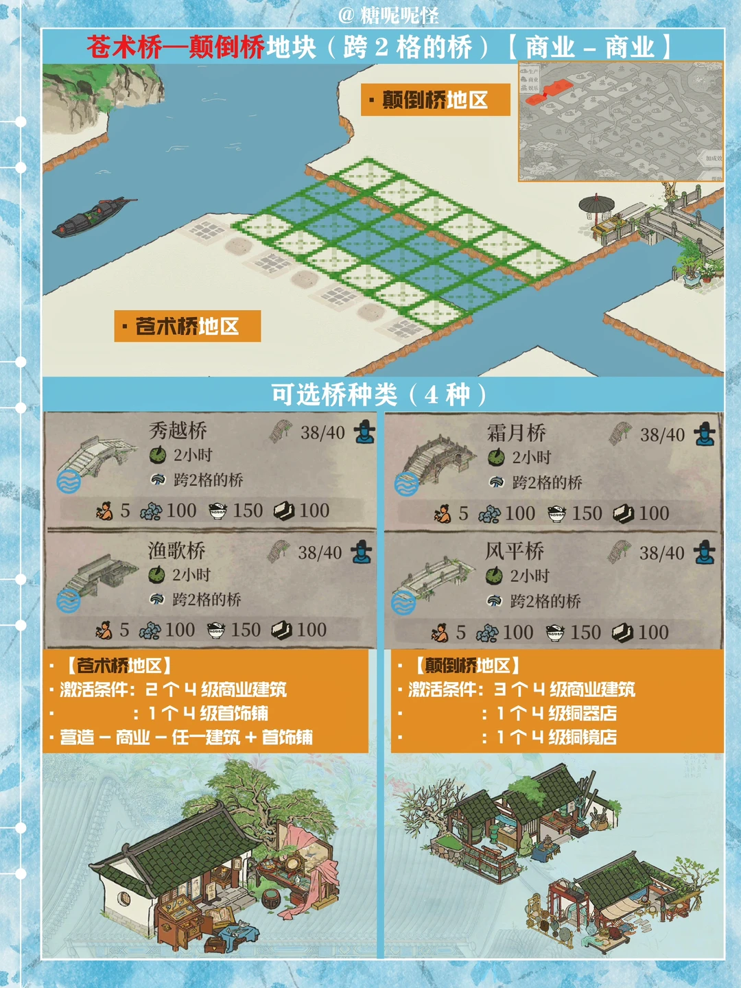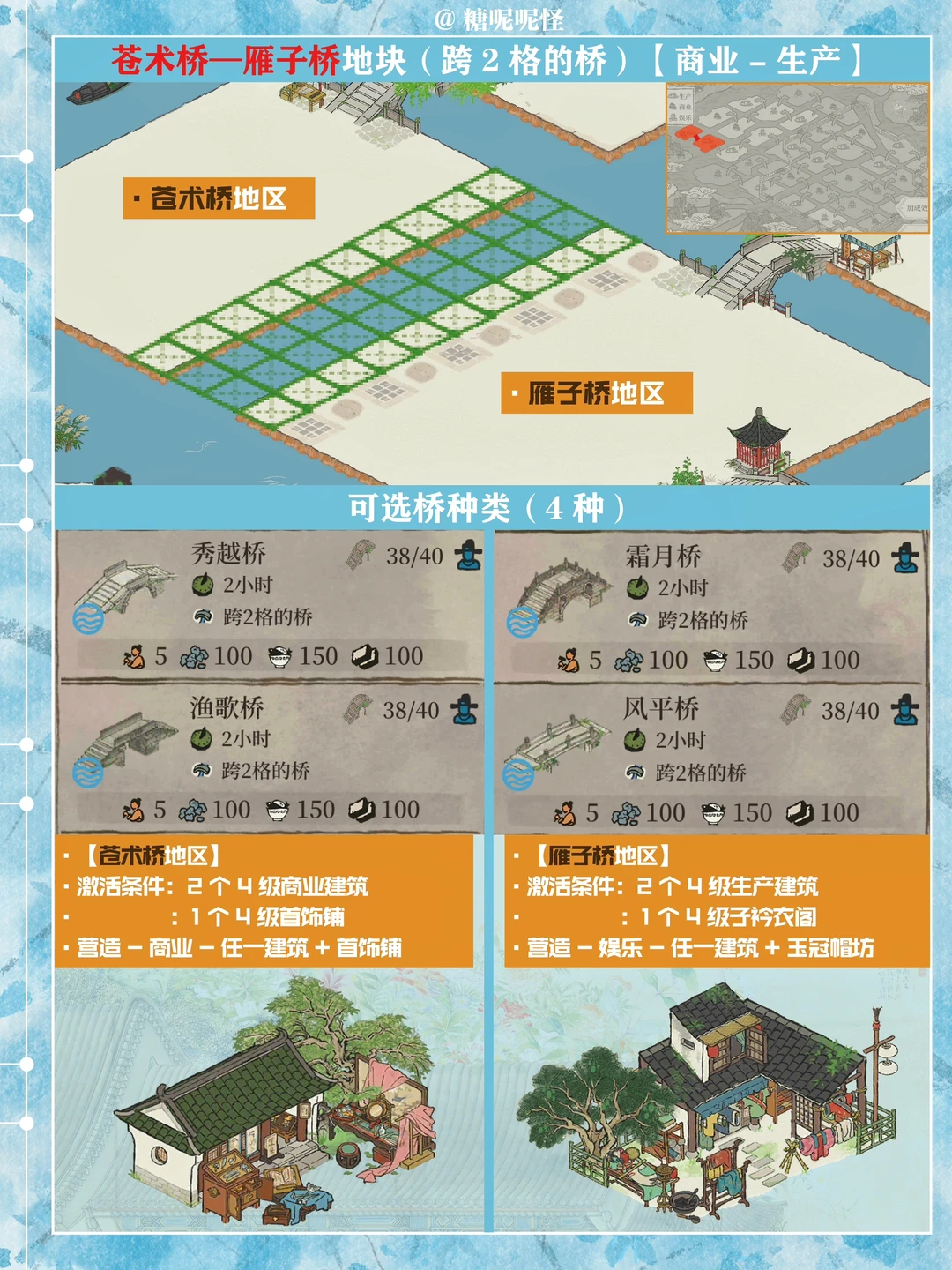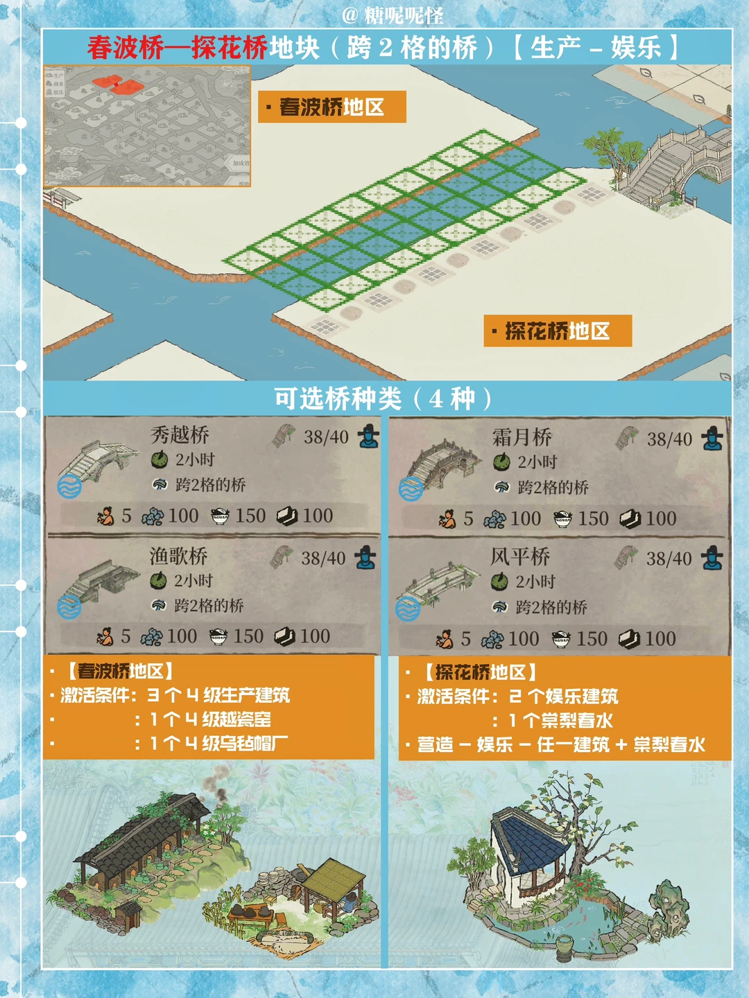 1️⃣此篇包含【苍术桥-雁子桥】【雁子桥-灯笼桥】【颠倒桥-灯笼桥】【苍术桥-颠倒桥】【灯笼桥-汲水桥】【颠倒桥-春波桥】【米市桥-探花桥】【春波桥-探花桥】区域的桥头小装饰汇总。 2️⃣每个地块的激活条件、可用桥梁及小桥装饰小景汇总 3️⃣同一位置放置不同桥梁的时候装饰小景是一样的,可以根据布局需求选择 4️⃣只能放18页图,其他地块的后面发