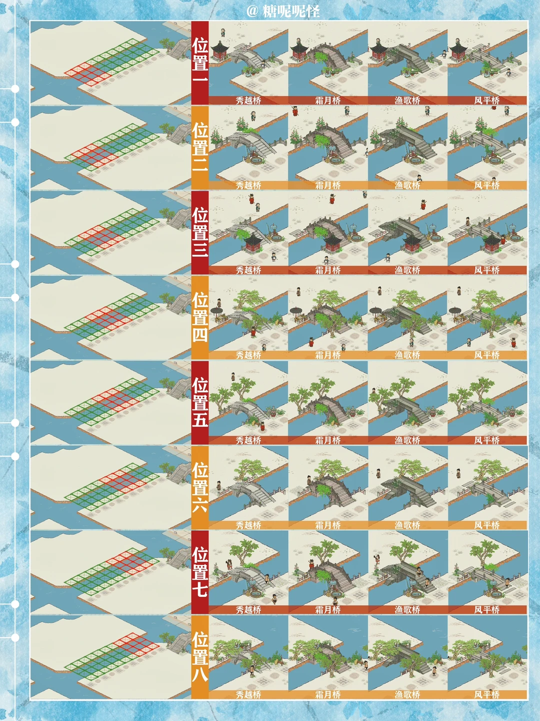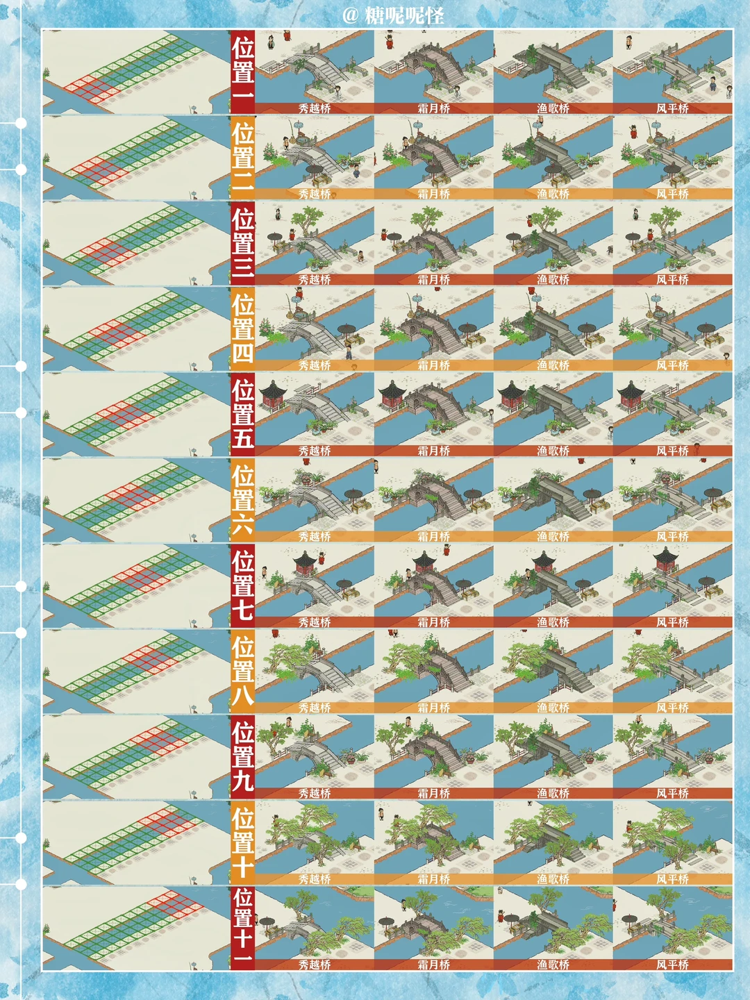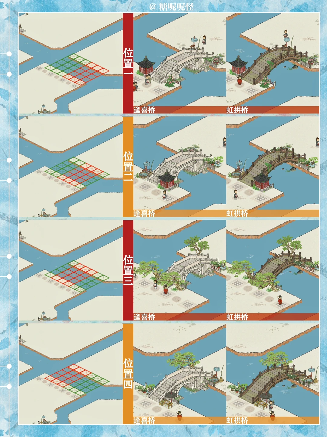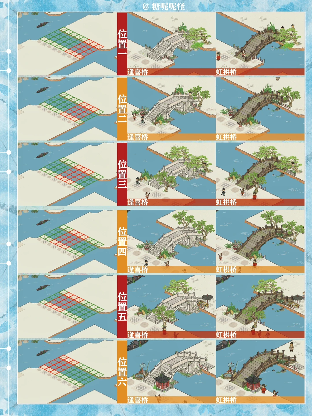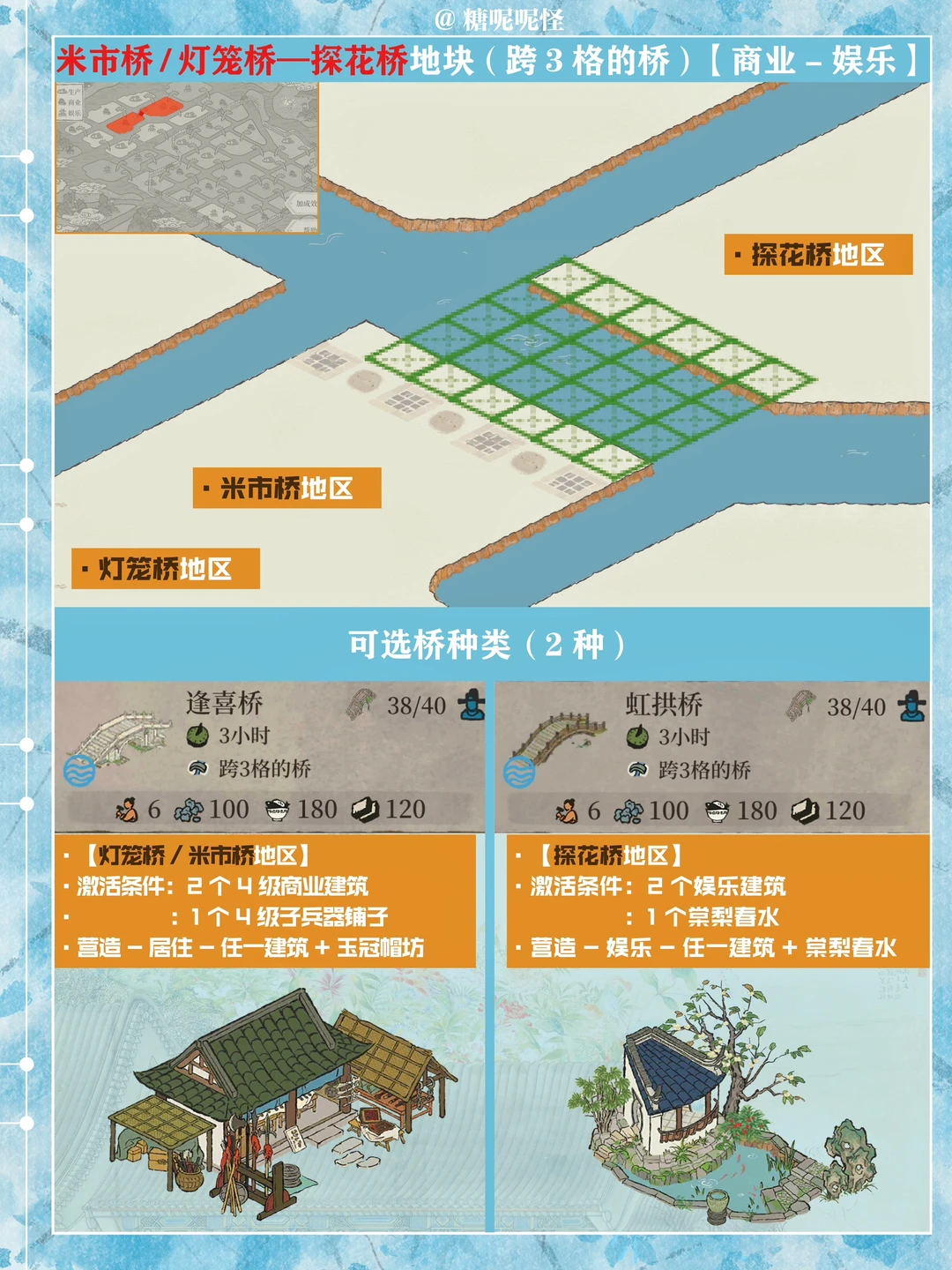 1️⃣此篇包含【苍术桥-雁子桥】【雁子桥-灯笼桥】【颠倒桥-灯笼桥】【苍术桥-颠倒桥】【灯笼桥-汲水桥】【颠倒桥-春波桥】【米市桥-探花桥】【春波桥-探花桥】区域的桥头小装饰汇总。 2️⃣每个地块的激活条件、可用桥梁及小桥装饰小景汇总 3️⃣同一位置放置不同桥梁的时候装饰小景是一样的,可以根据布局需求选择 4️⃣只能放18页图,其他地块的后面发