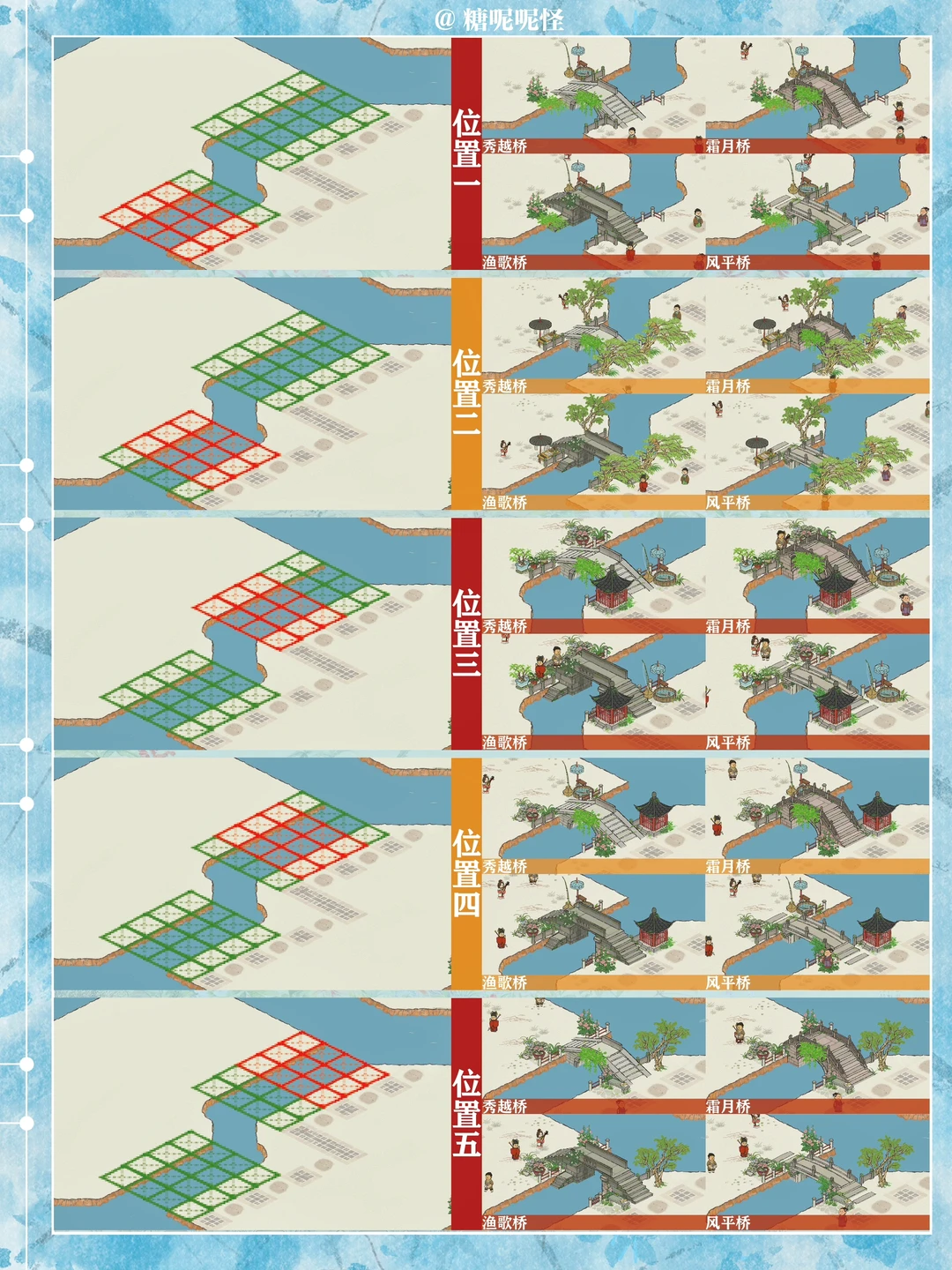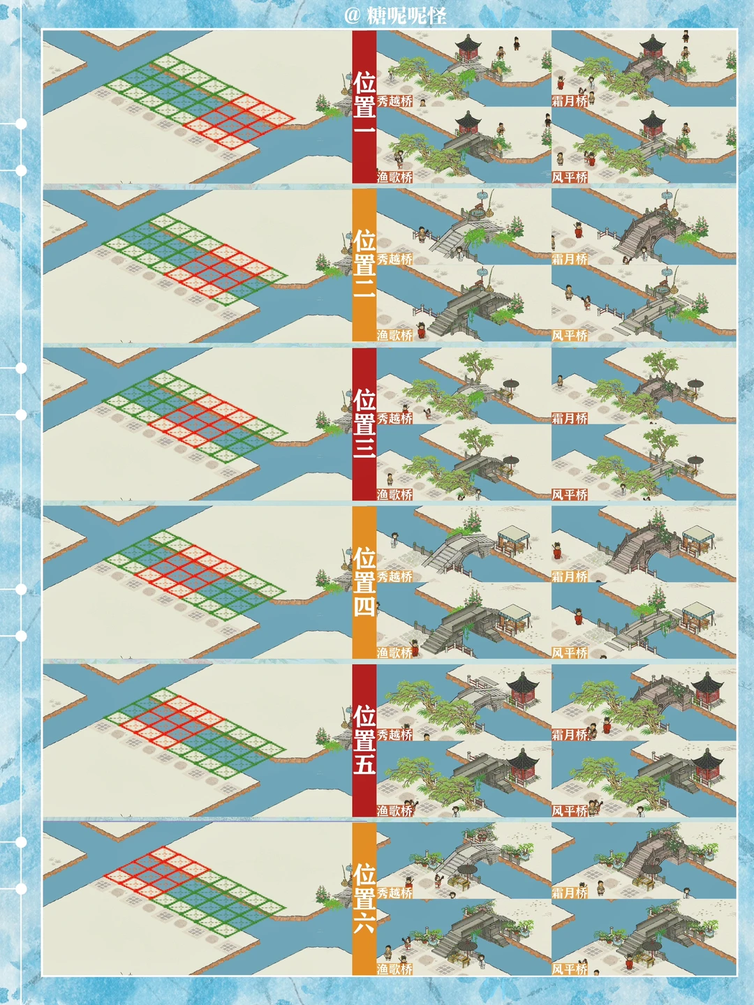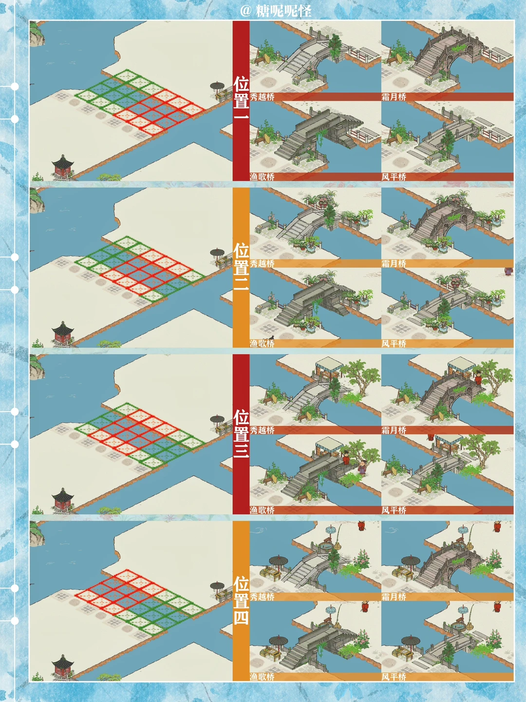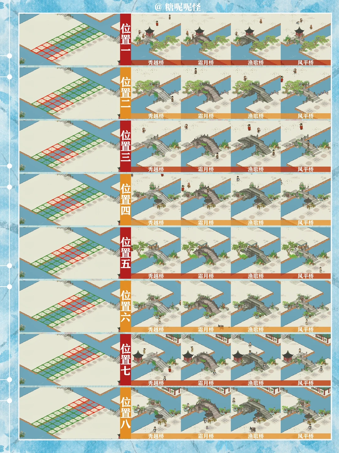 1️⃣此篇包含【苍术桥-雁子桥】【雁子桥-灯笼桥】【颠倒桥-灯笼桥】【苍术桥-颠倒桥】【灯笼桥-汲水桥】【颠倒桥-春波桥】【米市桥-探花桥】【春波桥-探花桥】区域的桥头小装饰汇总。 2️⃣每个地块的激活条件、可用桥梁及小桥装饰小景汇总 3️⃣同一位置放置不同桥梁的时候装饰小景是一样的,可以根据布局需求选择 4️⃣只能放18页图,其他地块的后面发